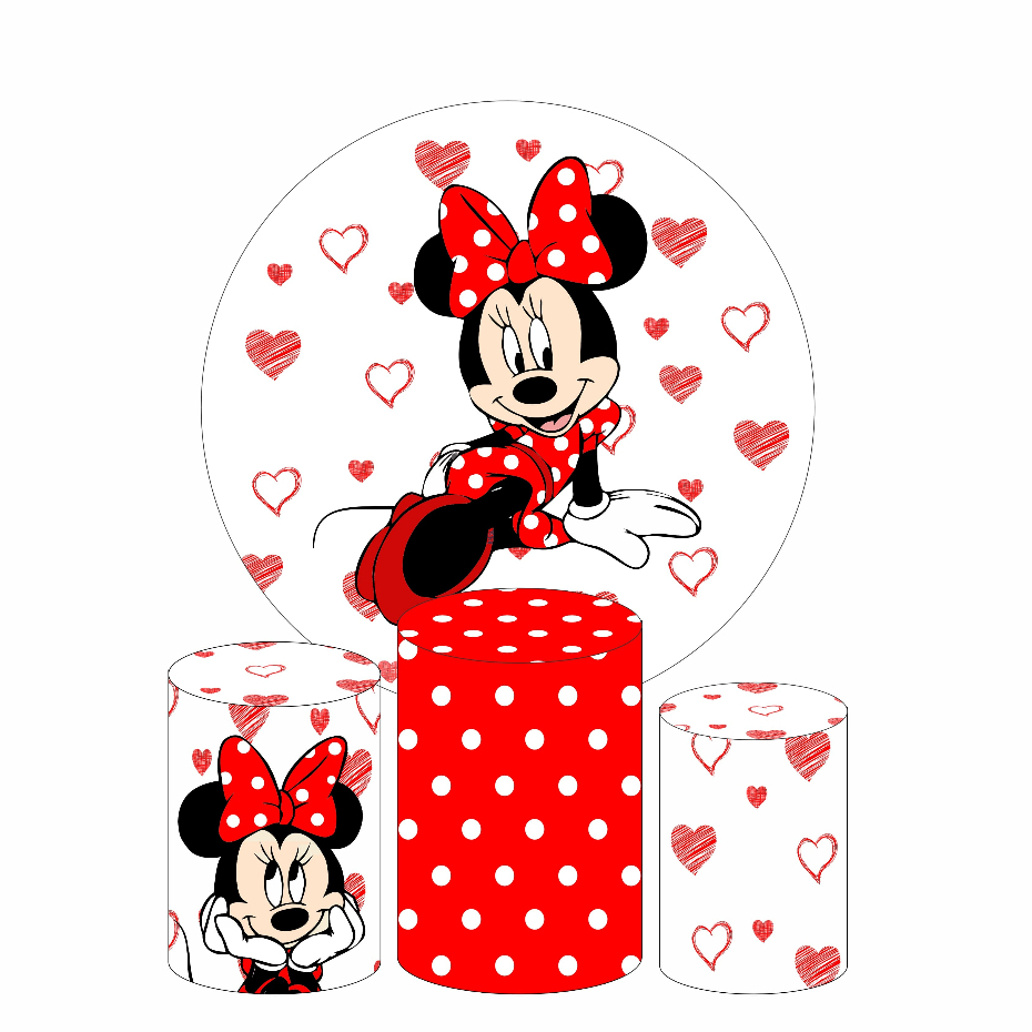 Kit Trio de Capas Cilindro + Capa Painel Redondo Decoração de Festa Infantil Minnie
