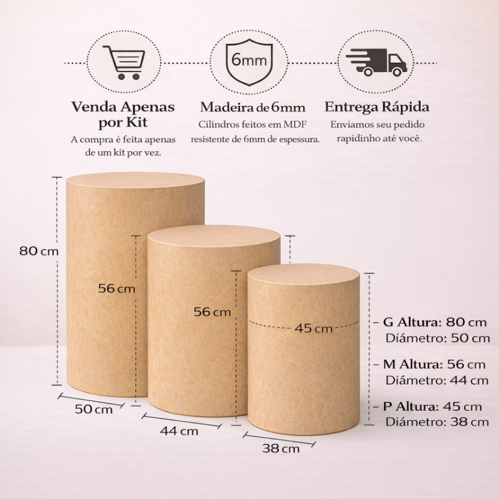 ATENÇÃO IMPORTANTE 🚨 Devido ao tamanho do produto e limitações de envio: 👉 A compra deve ser feita com apenas (um) kit. 👉 Pedidos com dois ou mais kits serão enviados com apenas um. 👉 Para mais kits efetuar uma compra por vez Conjunto de cilindros em MDF ideal para decoração de festas, eventos, vitrines e cenários. Produto resistente, prático e pronto para uso. ✔ Já vão montados ✔ Estrutura firme em MDF ✔ Design versátil para diversos tipos de eventos ✔ Podem ser armazenados encaixados (um dentro do outro) Medidas | Dimensões| Espessura CILINDRO G - Altura: 80 cm | Diâmetro: 50 cm | Circunferência: 157 cm CILINDRO M - Altura: 56 cm | Diâmetro: 44 cm | Circunferência: 138 cm CILINDRO P - Altura: 45 cm | Diâmetro: 38 cm | Circunferência: 120 cm