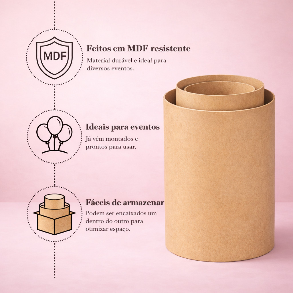 ATENÇÃO IMPORTANTE 🚨 Devido ao tamanho do produto e limitações de envio: 👉 A compra deve ser feita com apenas (um) kit. 👉 Pedidos com dois ou mais kits serão enviados com apenas um. 👉 Para mais kits efetuar uma compra por vez Conjunto de cilindros em MDF ideal para decoração de festas, eventos, vitrines e cenários. Produto resistente, prático e pronto para uso. ✔ Já vão montados ✔ Estrutura firme em MDF ✔ Design versátil para diversos tipos de eventos ✔ Podem ser armazenados encaixados (um dentro do outro) Medidas | Dimensões| Espessura CILINDRO G - Altura: 80 cm | Diâmetro: 50 cm | Circunferência: 157 cm CILINDRO M - Altura: 56 cm | Diâmetro: 44 cm | Circunferência: 138 cm CILINDRO P - Altura: 45 cm | Diâmetro: 38 cm | Circunferência: 120 cm