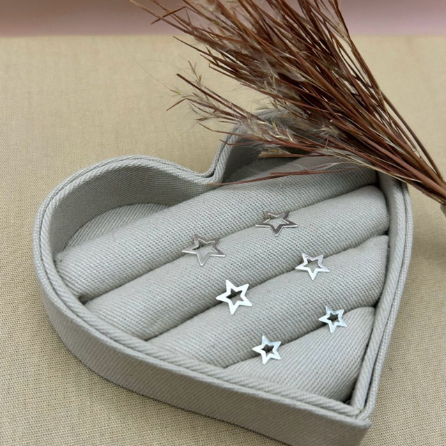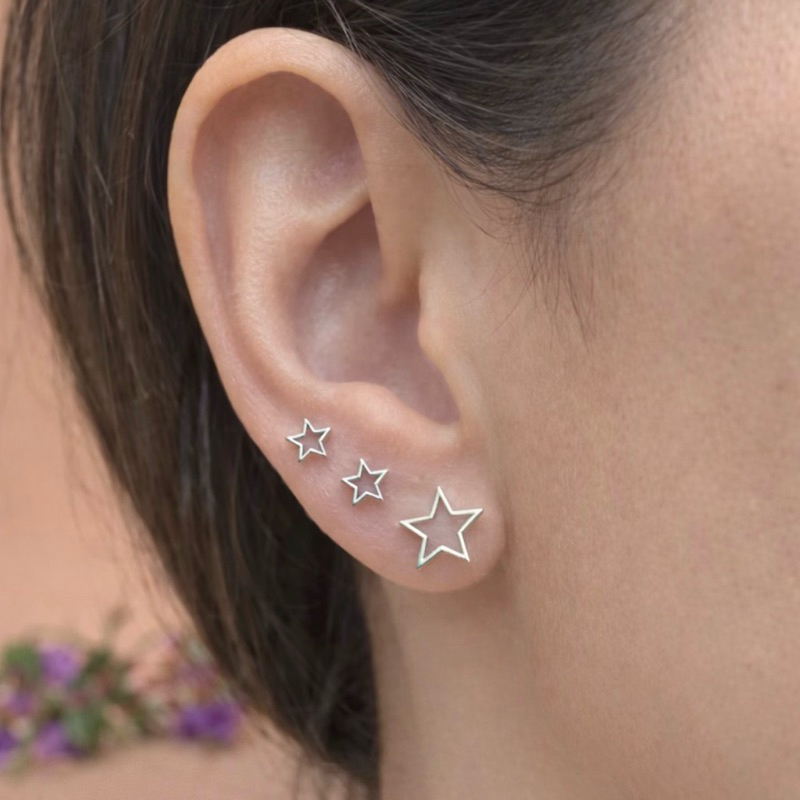 Brincos de estrela vazada em prata, com acabamento delicado e brilho suave. Um clássico minimalista para quem ama peças discretas e cheias de charme. A Enlo Pratas é uma loja especializada em joias confeccionadas em Prata 925 legítima de alta qualidade e com garantia vitalícia do metal. Somos uma empresa com CNPJ, portanto temos registro legal e emitimos NOTA FISCAL. Especificações do produto: Material: Prata 925 Legítima * TODOS OS NOSSOS PRODUTOS SÃO EM PRATA 925 LEGÍTIMA E ACOMPANHAM GARANTIA Itens inclusos: * Certificado de Garantia da Prata 925 * Kit 3 Pares de Brincos - 6 unidades no total Perguntas frequentes: - As joias são de prata 925 legitima/maciça ? Sim, nossas joias são feitas de prata maciça 925 de alta qualidade. - Qual o prazo de envio? Enviamos os itens em até 1 dia útil. - Acompanha Certificado? Sim, enviamos certificado de garantia do material - Acompanha embalagem para presente? Não. - Joias em prata precisam ser limpas? Sim, a prata é um metal que sofre oxidação, porém após ser limpa a mesma retorna ao seu brilho oriainal!!