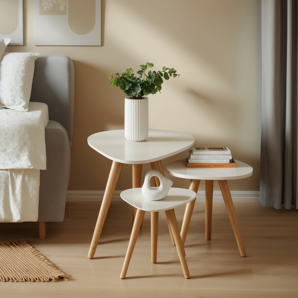 Kit Trio Jogo de Mesinhas Lateral Sala Pé Palito Retro Tampo Orgânico Casa