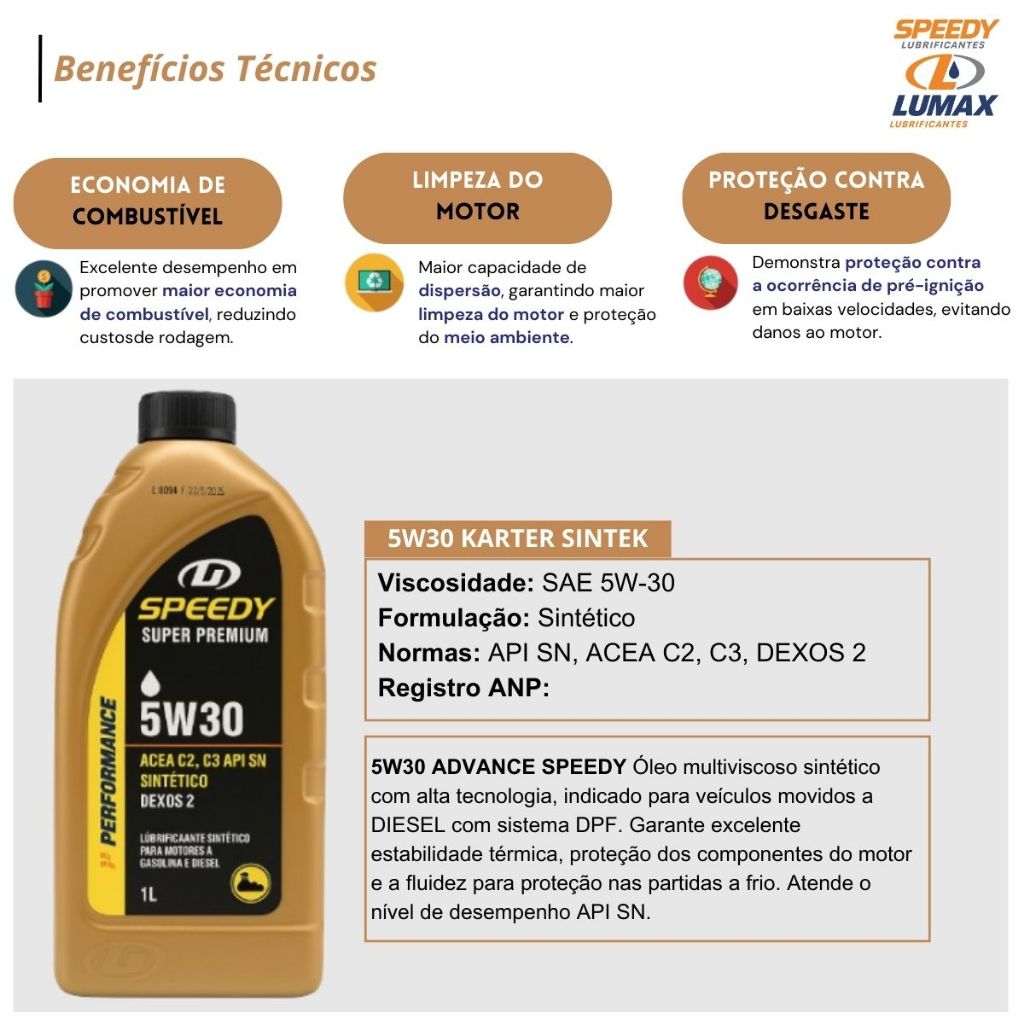 A troca correta do filtro de combustível evita problemas na bomba de alta pressão e nos bicos injetores do seu veículo, aumentando a vida útil e diminuindo o custo de manutenção. Kit Troca de Oleo Amarok 2.0 - 2015 2016 2017 2018 2019 2020 ÓLEO 5W30 SINTÉTICO DIESEL COM O MELHOR CUSTO/BENEFÍCIO DO MERCADO Oleo 5W30 Sintético Diesel Speedy Super Premium ACEA C2 C3 API SN DEXOS 2 100% recomendado para veículos diesel e com sistema de DPF Conteúdo: - 07 Litros de óleo 5W30 Sintético Diesel Speedy Super Premium ACEA C2 C3 API SN DEXOS 2 - 01 Filtro de óleo original - PEL677 Tecfil ou OX388D Mahle Metal Leve ou HU7008Z Mann - 01 Filtro de ar original - ARL6070 Tecfil ou LX3234 Mahle Metal Leve ou C310031 Mann - 01 Filtro de combustível original - FCI1275 Tecfil ou KL1079 Mahle Metal Leve Tecfil 1ª linha, maior fabricante de filtros do continente O óleo 5W30 Sintético Diesel Speedy Super Premium ACEA C2 C3 API SN DEXOS 2 foi desenvolvido com a mais elevada tecnologia de aditivação multifuncional, que proporciona maior eficiência energética ao motor, com adicional proteção contra o desgaste, formação de depósitos e borra, que se traduzem na manutenção da potência do seu veículo e no prolongamento da sua vida útil, preservando os componentes do sistema de pós-tratamento, como catalisadores e sistemas de filtros de partículas que equipam os veículos mais modernos A fórmula avançada do óleo de motor 5W30 Sintético Diesel Speedy Super Premium ACEA C2 C3 API SN DEXOS 2 foi desenvolvida para atender às necessidades dos motores modernos que possuem sistema de pós-tratamento DPF e válvula EGR, que precisam de uma lubrificação mais eficiente. O 5W30 Sintético Diesel Speedy Super Premium ACEA C2 C3 API SN DEXOS 2 foi elaborado para atender e superar os requisitos dos principais fabricantes de veículos do mercado nacional e internacional, com desempenho superior em relação aos óleos de base mineral ou semissintética. Garante a performance ideal dos motores, ajudando a manter por mais tempo as suas características originais de limpeza e desempenho, mesmo sob os mais diversos regimes de uso aos quais os veículos são submetidos no dia a dia. CARACTERÍSTICAS E BENEFÍCIOS EXCEPCIONAL RESISTÊNCIA AO CALOR E À OXIDAÇÃO Os aditivos antioxidantes combinados com sua composição sintética reduzem a velocidade da oxidação gerada pelas altas temperaturas de funcionamento do motor e minimizam o espessamento do óleo, mantendo por mais tempo as características originais do lubrificante, mesmo sob o regime severo do “anda e para” encontrado no trânsito das grandes cidades. ECONOMIA DE COMBUSTÍVEL Sua baixa viscosidade aliada à tecnologia de redução de atrito, reduzem a resistência ao movimento entre as peças, contribuindo favoravelmente para a redução no consumo de combustível e na redução de emissão de gases poluentes. MANUTENÇÃO DA LIMPEZA INTERNA DO MOTOR A fuligem produzida pela combustão é quebrada em pequenas partículas que são transportadas mais facilmente pelo óleo até o filtro, evitando a formação de depósitos e o acúmulo de borra, garantindo a limpeza e a eficiência do motor. MAIOR PROTEÇÃO NO MOMENTO DA PARTIDA A rápida circulação do óleo no momento da partida confere uma excelente lubrificação nos componentes mais críticos, acelerando a lubrificação hidrodinâmica que afasta as partes metálicas, reduzindo assim o desgaste inicial. BAIXO TEOR DE CINZAS SULFATADAS Protege o sistema de emissão, ajudando a manter limpo o filtro de partículas. BAIXA PERDA POR EVAPORAÇÃO Formulado com óleos básicos sintéticos que conferem ao lubrificante menor volatilidade, reduzindo a perda por evaporação, diminuindo consumo e aumentando o intervalo de troca. BAIXO CISALHAMENTO Sua aditivação promove maior resistência da película lubrificante ao cisalhamento, assegurando menor variação da viscosidade durante o intervalo de troca. O óleo de motor 5W30 Sintético Diesel Speedy Super Premium ACEA C2 C3 API SN DEXOS 2 EXé a melhor escolha para quem quer proteger o motor do seu carro e garantir o seu desempenho por muitos anos. Aproveite a oferta especial e garanta o seu kit hoje mesmo! Esta oferta é limitada, por isso não perca a oportunidade de garantir a melhor proteção para o motor do seu carro. Se tiver alguma dúvida entre em contato conosco! Sua satisfação é nossa prioridade! Marca: Volkswagen Número de peça: revisao troca de oleo Inclui filtro de ar: Sim Inclui filtro de óleo: Sim Inclui filtro de ar condicionado: Não Inclui filtro de combustivel: Sim Inclui óleo: Sim ATENÇÃO: - Não nos responsabilizamos pelo mau uso ou instalação indevida do produto. - Recomendamos que a instalação seja realizada por um profissional especializado. - Algumas imagens ( fotos ) são meramente ilustrativas. O FILTRO DE COMBUSTÍVEL PODERÁ SER ENVIADO DAS MARCAS: TECFIL, MANN FILTER, OU MAHLE DE ACORDO COM A DISPONIBILIDADE DE ESTOQUE.