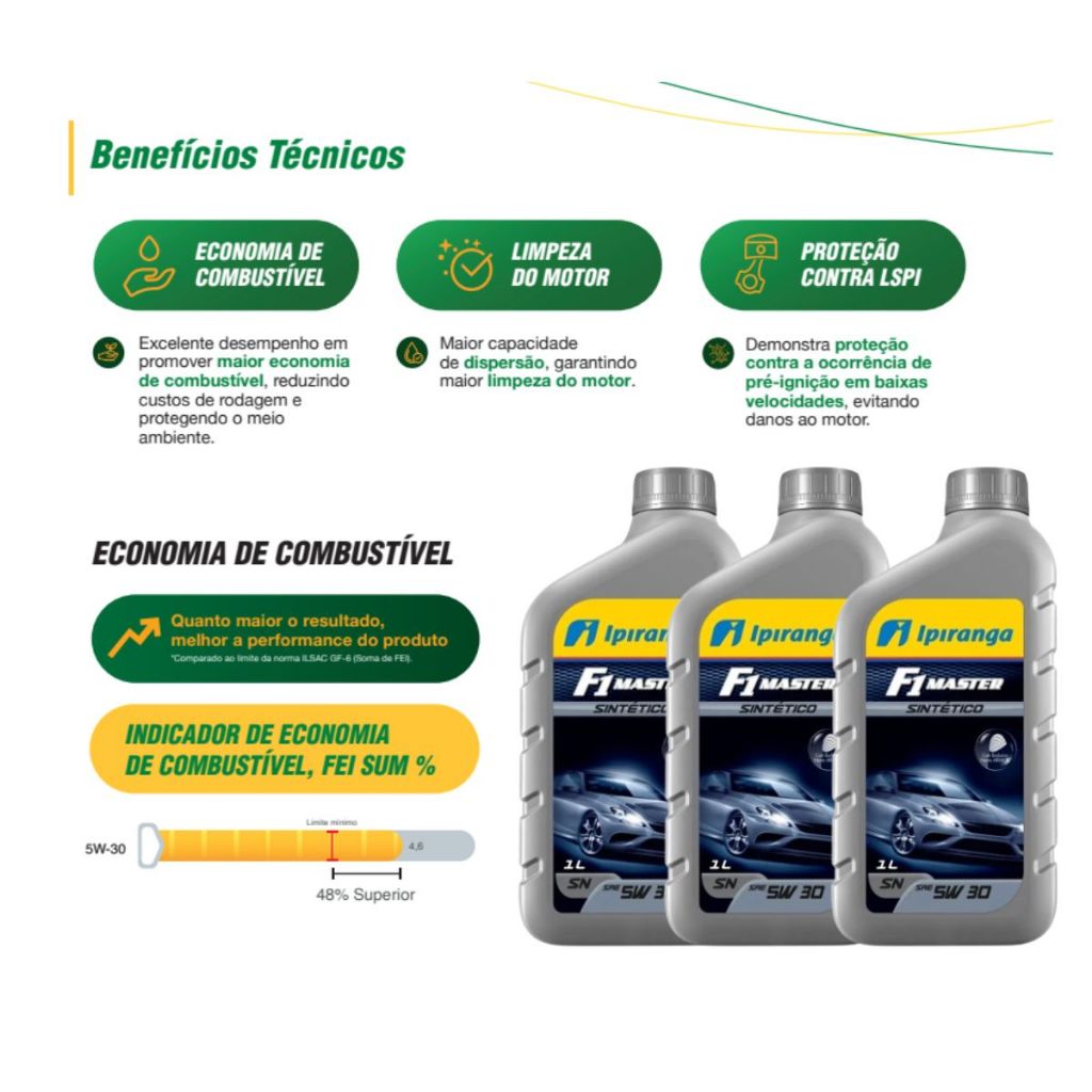 Bem Vindo a loja oficial da VGFC AUTO PARTS! A satisfação dos nossos clientes é a nossa prioridade! Retire suas dúvidas antes de realizar a compra! **ORIGINAL DO VEÍCULO, RECOMENDADO PELO FABRICANTE** Compativel com: toda linha Corsa e Classic, só não serve para o Corsa frente de Montana. Ano: 1996 1997 1998 1999 2000 2001 2002 2003 2004 2005 2006 2007 2008 2009 2010 2011 2012 2013 2014 2015 Conteúdo: 04 Litros de óleo IPIRANGA 5W30 SINTETICO API SN Nano ARMOR™ 01 Filtro de óleo - PSL619 - Tecfil 01 Filtro de óleo combustível - GI04/7 - Tecfil 01 Filtro de ar - ARL8832 Tecfil Filtros tecfil 1ª linha, maior fabricante de filtros do continente IPIRANGA 5W30 SINTETICO API SN Nano ARMOR™ é um óleo lubrificante 100% sintético. Sua formulação atua no controle sobre a formação de borra e o espessamento do óleo, com maior proteção contra o desgaste visando a durabilidade do motor. A fórmula avançada do óleo de motor IPIRANGA 5W30 SINTETICO API SN Nano ARMOR™ foi desenvolvida para atender às necessidades dos motores modernos, que precisam de uma lubrificação mais eficiente. O IPIRANGA F1 MASTER SINTÉTICO 5W30 SN foi elaborado para atender e superar os requisitos dos principais fabricantes de veículos do mercado nacional e internacional, com desempenho superior em relação aos óleos de base mineral ou semissintética. Garante a performance ideal dos motores, ajudando a manter por mais tempo as suas características originais de limpeza e desempenho, mesmo sob os mais diversos regimes de uso aos quais os veículos são submetidos no dia a dia. Além disso, o óleo IPIRANGA 5W30 SINTETICO API SN Nano ARMOR™ é compatível com a maioria dos veículos, incluindo carros, picapes e SUVs. CARACTERÍSTICAS E BENEFÍCIOS MAIOR PROTEÇÃO NO MOMENTO DA PARTIDA A rápida fluidez do óleo no momento da partida confere uma excelente lubrificação nos componentes mais críticos, reduzindo assim o desgaste inicial. ELEVADA PROTEÇÃO CONTRA O DESGASTE A ação antidesgaste cria uma camada protetora ultrarresistente que reduz o atrito metálico entre as peças, diminuindo o desgaste prematuro e prolongando a vida útil dos componentes internos do motor. EXCELENTE ESTABILIDADE AO CISALHAMENTO Permite que o óleo mantenha a viscosidade adequada durante o trabalho no motor, garantindo a resistência da película lubrificante, evitando falhas de lubrificação. EXCEPCIONAL RESISTÊNCIA AO CALOR E À OXIDAÇÃO Sua formulação sintética, aliada aos aditivos antioxidantes, oferece maior resistência à oxidação causada pelas altas temperaturas de funcionamento do motor, minimizando o espessamento do óleo e mantendo por mais tempo as características originais do lubrificante, mesmo sob o regime severo do anda e para encontrado no trânsito das grandes cidades. MANUTENÇÃO DA LIMPEZA INTERNA DO MOTOR A fuligem produzida pela combustão é quebrada em pequenas partículas que são transportadas mais facilmente pelo óleo até o filtro, evitando a formação de depósitos e o acúmulo de borra, garantindo a limpeza e a eficiência do motor. O óleo de motor IPIRANGA 5W30 SINTETICO API SN Nano ARMOR™ é a melhor escolha para quem quer proteger o motor do seu carro e garantir o seu desempenho por muitos anos. Aproveite a oferta especial e garanta o seu kit hoje mesmo! Esta oferta é limitada, por isso não perca a oportunidade de garantir a melhor proteção para o motor do seu carro. Se tiver alguma dúvida entre em contato conosco! Sua satisfação é nossa prioridade! ATENÇÃO: - Não nos responsabilizamos pelo mau uso ou instalação indevida do produto. - Recomendamos que a instalação seja realizada por um profissional especializado. - Algumas imagens ( fotos ) são meramente ilustrativas. VGFC DISTRIBUIDORA É UMA EMPRESA DO GRUPO ZT DIESEL ESPECIALIZADA EM AUTO PEÇAS E REPARAÇÃO VEICULAR ATUANDO NO MERCADO DESDE 1993!