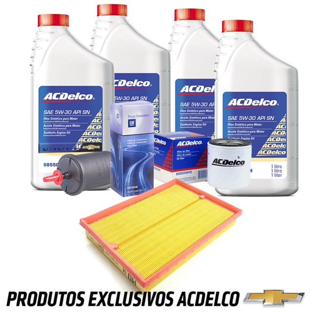 Kit com 1 Filtro de Óleo do Motor Acdelco 1 Filtro de ar do Motor Genuíno 1 Filtro de Combustível FLEX Original Chevrolet 4 Litros de Óleo 5W30 100% Sintético Original Chevrolet