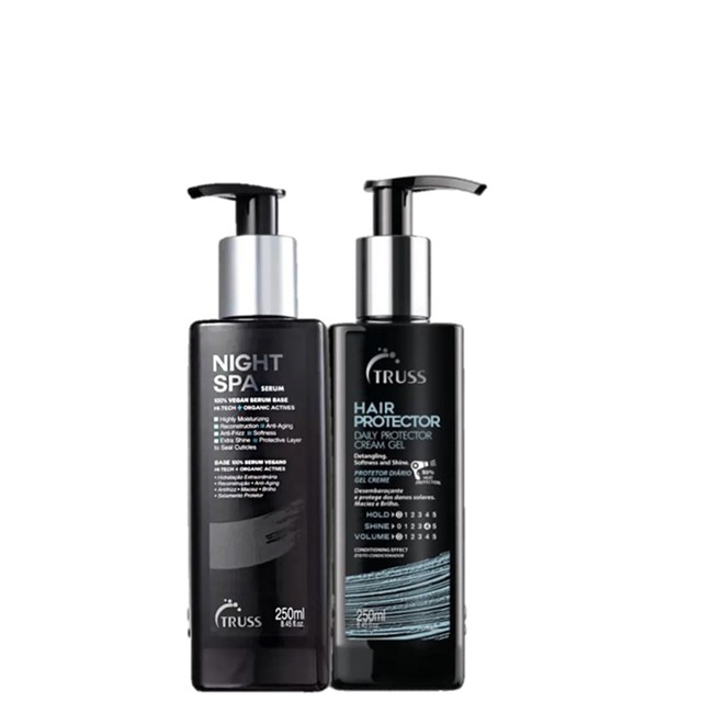 Kit Truss Dupla Night Protector (2 Produtos) Kit Truss Dupla Night Protector indicado para todos os tipos de cabelos. Promove hidratação profunda que revitaliza os fios. Kit Contém Truss Nigth Spa - Sérum de Tratamento Noturno 250ml: Previne a ação dos agentes externos, que reduzem o frizz e aumenta o brilho. Regenera a fibra capilar danificada e disciplina fios rebeldes. Truss Hair Protector - Leave-in 250ml: desembaraça e protege dos raios UV, calor do secador e dos danos mecânicos causados pela escova. Como Usar Conselho de Aplicação Sérum: Aplique o sérum no comprimento e nas pontas (nunca na raiz) do cabelo seco à noite, mecha a mecha e massageie. Deixe agir durante o sono. No dia seguinte, lave de 2 a 3 vezes como de costume. Leave-in: Aplique uma pequena quantidade do leave-in na palma das mãos e distribua sobre comprimento e pontas dos cabelos úmidos. Depois, seque seus fios com o auxílio do secador e modele como desejar.