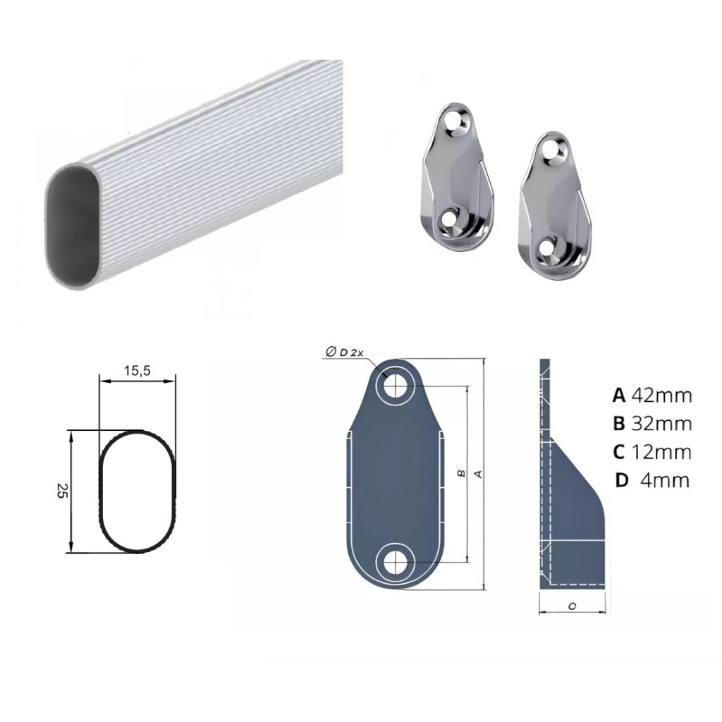 Kit Tubo Cabideiro Cabide Arara Guarda Roupas Tubo Oval 100cm Alumínio Mais 2 Suportes Laterais