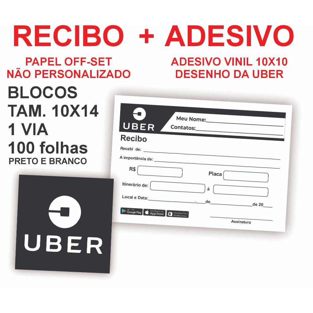 Kit UBER RECIBO + ADESIVO O bloco contém 100 folhas Impressão Off-set preto (não desbota em contato com umidade) Formato: 10x14cm; Blocado com cola vermelha Contra Capa em Kraft. Papel: Off Set Gramatura mista 60/70/75g (Branco/areia). 01 Adesivo plástico á prova d'água, para vidro, tamanho 10x10 Temos PRONTA ENTREGA!