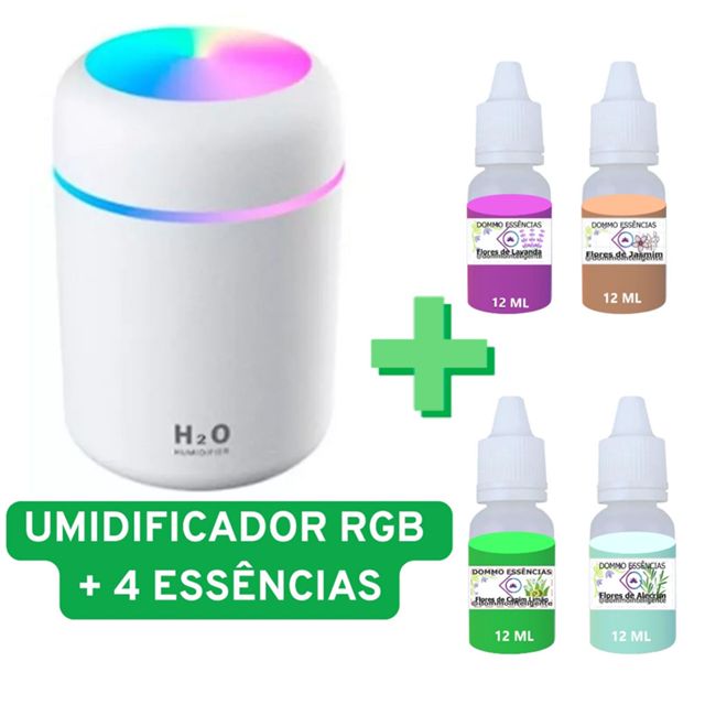 KIT Umidificador Aromatizador com Luzes RGB 300ml +4 Essências Difusor PORTÁTIL Aroma 12mL L.CL.J.A