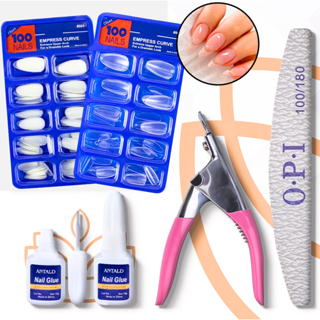 KIT- UNHA POSTICA AMENDOADA REALISTA Leitosa ou Transparente Cola com Pincel Cortador de Tips e lixa