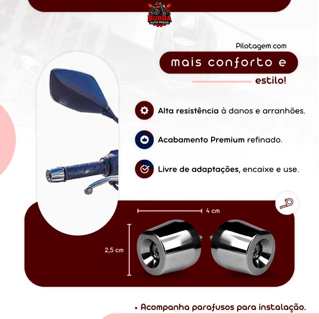 Kit Manopla + Peso de Guidão em Alumínio Polido Conjunto completo com excelente acabamento para garantir maior estabilidade, estética e proteção para o guidão da sua moto. Compatível com diversos modelos: ✔️ PCX ✔️ CG Cargo / Titan / Fan 125, 150, 160 ✔️ XRE 190 / XRE 300 ✔️ Biz 100 / 110 / 125 ✔️ Pop 100 / Pop 110 ✔️ NXR Bros 160 E diversos outros modelos Conteúdo do kit: Pesos de Guidão em alumínio polido Parafusos para fixação Manoplas Modelo CG Cargo Caso compre a opção "Peso + Manopla + Bucha" você receberá o kit completo com Bucha Expansiva para adaptação de Guidões ocos sem bucha. ✅ Modelo universal com encaixe fácil ✅ Alta durabilidade e acabamento premium ✅ Pronta entrega – Envio imediato! Produto ideal para quem busca qualidade, segurança e um visual renovado para sua moto.