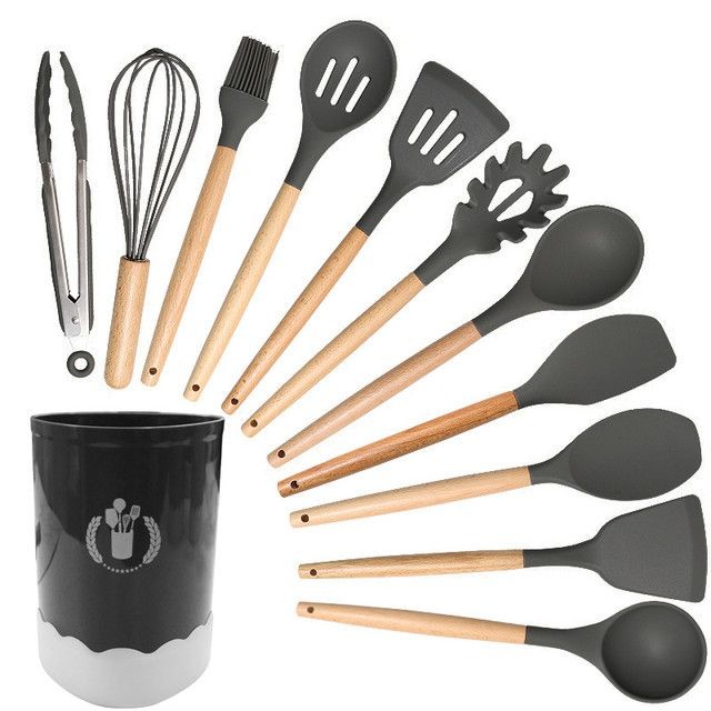 Kit Utensílios De Cozinha 12 Peças Silicone Preto Luxo Cabo Madeira Antiaderente Durável