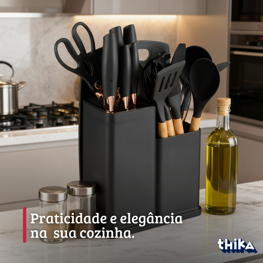 Kit Utensílios de Cozinha Silicone 19 Peças Preto Thika
