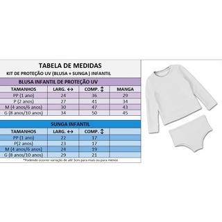 Nossos Kit uv de proteção São Maravilhosos! Camiseta de Manga Longa: Feita de tecido com fator de proteção UV (UPF) 50, cobre braços e parte superior do corpo. Sunga Modelo tradicional com cordão: Feita de tecido com fator de proteção UV (UPF) 50, cobre braços e parte superior do corpo. Benefícios de Usar um Kit UV Infantil com Proteção 50 Proteção Eficiente: Bloqueia até 98% dos raios UV, reduzindo o risco de queimaduras solares e danos à pele. Conforto e Mobilidade: Feito de materiais leves e elásticos que permitem liberdade de movimento. Resistência à Água: Muitas peças são resistentes à água e secam rapidamente, ideal para uso na praia ou piscina. Prevenção de Problemas de Saúde: Ajuda a prevenir problemas de pele a longo prazo, como o câncer de pele e envelhecimento precoce. Tamanho Adequado: Verifique as medidas para garantir que as roupas se ajustem bem à criança