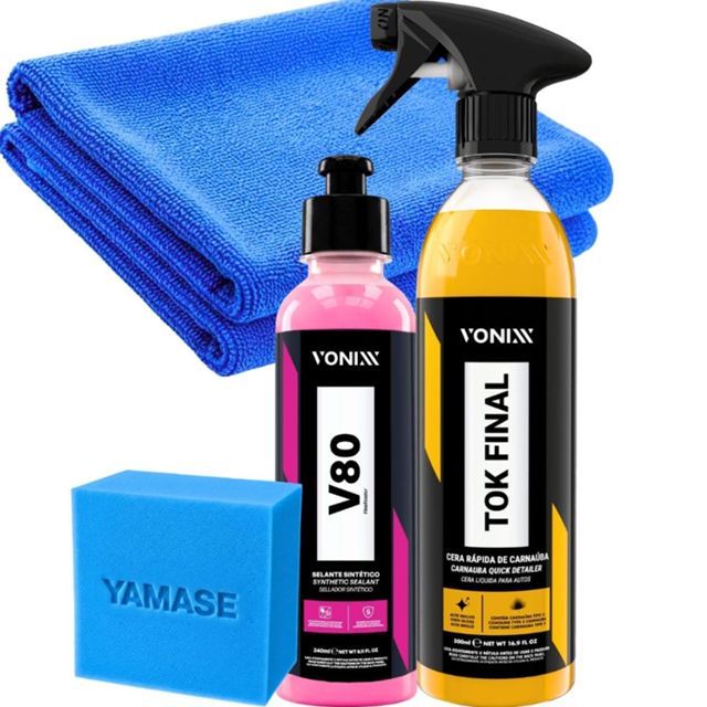 KIT CONTÉM: 1- TOK FINAL 500ML 1- V80 240ml 1- PANO MICROFIBRA SORTIDO DESCRIÇÃO: TOK FINAL 500ml TOK FINAL foi desenvolvida com a mais pura cera de carnaúba cearense e polímeros de última geração, que protegem e realçam o brilho de pinturas automotivas. É ideal para ser usada após a lavagem e na manutenção da proteção da pintura do veículo entre os enceramentos. Pode ser aplicada em toda parte do veículo, incluindo vidros, para-choques e borrachas. DILUIÇÃO: Pronto uso. MODO DE USO: 1 - Agitar bem o produto antes de usar. 2 - Após lavar e secar o veículo, pulverizar o produto puro na superfície em área não superior à 60cm x 60cm. 3 - Em seguida, realizar o acabamento com toalha ou pano de microfibra até obter o brilho desejado. 4 - Repetir o procedimento até a conclusão do veículo. SELANTE SINTÉTICO V80 VONIXX Foi desenvolvido para proporcionar alta proteção e poder hidrofóbico à pintura do veículo. Sua fórmula exclusiva auxilia na eliminação de pequenas imperfeições e promove o brilho molhado e profundo na pintura. DURABILIDADE: - Até cinco meses de proteção na pintura CARACTERISTICAS: - Fácil aplicação e remoção - Alta proteção contra raios UV - Tecnologia de polímeros hidrofóbicos MODO DE USO: 1 - Agitar bem o produto antes de usar 2 - Aplicar pequena quantidade do produto usando aplicador de espuma, realizando movimentos circulares e uniformes 3 - Aguardar secar por no mínimo 15 minutos para que o produto atinja o ponto de cura 4 - Remover o produto utilizando toalha de microfibra limpa e seca aé obter um brilho impecável