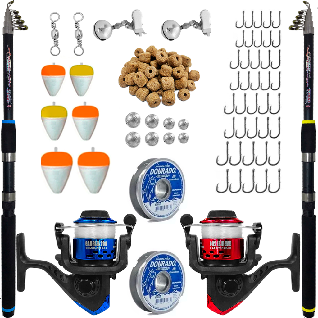 2 Varas Telescopica para Molinete 2,70m suporta 4KG Fibra de Vidro cabo em EVA, passadores em cerâmica 2 Molinetes Toto 200, BH200 Jimmy ou Sol da Marine Sports com 1 rolamento, sistema balanceado, relação de recolhimento 5.2:1, carretel em plástico, super leve e macio para uso. Capacidade de linha 0,18mm 245m 0,20mm 200m 0,25mm 125m 2 linha 0,20 ou 0,25mm monofilamento marca conforme a disponilibidade ( em alguns molinete a linha ja vai enrolada) Anzol 4330 Super Strong Marine Sports Niquelado Nickel, pois possui farpas muito eficiente que auxilia na fisgada do peixe. 10 Anzol 4330 Nº1 (3,1 cm) 10 Anzol 4330 Nº6 (2,0 cm) 10 Anzol 4330 Nº8 (1,8cm) 10 Anzol 4330 Nº10 (1,5 cm) Chumbo bolinha, utilizado para pesca de fundo. 2 Chumbo de 2gr 2 Chumbo de 6gr 2 Chumbo de 8gr 2 Chumbo de 10gr Boia em isopor colorida, possui um bastão de plastico para a passagem da linha. 2 Boia nº4 2 Boia nº5 2 Boia nº6 2 Giradores simples em aço carbono nº7, Utilizado para evitar torção da linha. 2 Sinete/Guizo de Espera utilizado em varas para deixar em espera aguardando o peixe puxar. 1 Pacote com isca furadinha 100 gramas ======================================================================= Nossa empresa atua exclusivamente no comércio de PESCA, CAMPING e LAZER. Trabalhamos com as melhores e mais renomadas marcas do mercado. Confira algumas vantagens de comprar conosco: - Temos CNPJ, somos uma empresa consolidada - Emitimos Nota Fiscal eletrônica - Postamos sua encomenda no mesmo dia ou NO MÁXIMO no próximo dia útil - GARANTIA dos produtos vendidos - Todos os produtos são TESTADOS antes do envio - Produtos a pronta entrega - Atendimento personalizado - Produtos ORIGINIAIS de alta qualidade Nossos horários de atendimento: - SEG A SEX das 9h00 às 18:30hs
