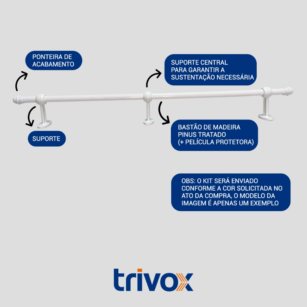 Nossa linha de kits de varão são ideais para quem busca praticidade, ótimo acabamento e facilidade na instalação sem ajuda profissional. Indicada para cortinas, blackouts, corta luz e passa varão com acabamento em ilhoses, alças ou argolas. VANTAGENS: - Ideal para quem procura um ótimo custo x benefício - Esteticamente charmoso - Prático para instalar CONTEÚDO DA EMBALAGEM: - 02 varões de MADEIRA com 1,00 mt de comprimento, totalizando 2 metros, com diâmetro de 19 mm (Fino) - 03 suportes de parede + 2 ponteiras para dar o acabamento nas extremidades do varão - 06 parafusos e buchas para fixação dos suportes (para cada suporte vai 2 parafusos e 2 buchas de fixação) - 01 emenda para encaixe (cavilha). CARACTERISTICAS Diâmetro: 19mm de diâmetro Material do suporte e ponteiras: Polipropileno (Plástico) Material do varão: Madeira revestido com material colorido em PVC (película plástica), ou seja, não é pintado. - GARANTIA DO FABRICANTE - STD HOME - 30 ANOS DE MERCADO OBSERVAÇÃO: - Kit varão de 2 metros é dividido em duas (02) partes de 1 metro cada, sendo necessária a emenda para junção (Já incluso no pacote). - Não acompanha a cortina. - As cores podem sofrer pequenas alterações de acordo com as configurações e da resolução do seu monitor/tela Para limpeza é indicada a utilização do espanador de pó ou pano levemente umedecido em água, seguido de pano seco. Não utilizar produtos químicos abrasivos na limpeza. Evitar impactos e contato com objetos cortantes.