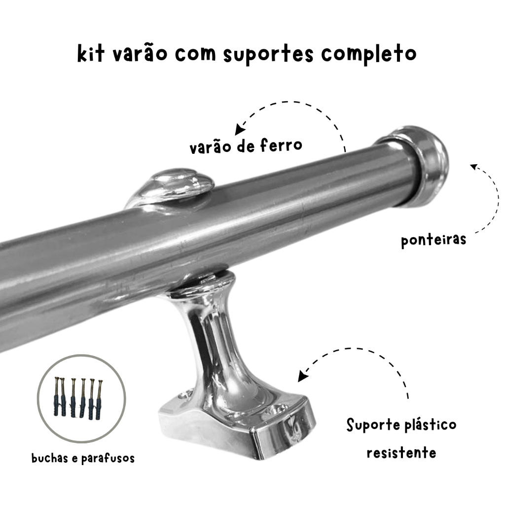 | kit Varão para cortina bastão 19mm c/ Fixações Prático cromado varal este produto | R$ 32,10 | 10% | 4.6/5 | 10 |
