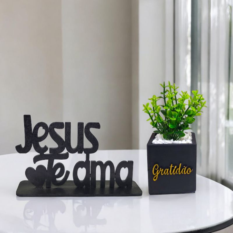 Kit Vasinho com plantinhas Artificiais mais Letreiro Jesus te ama. Cachepot Mdf.