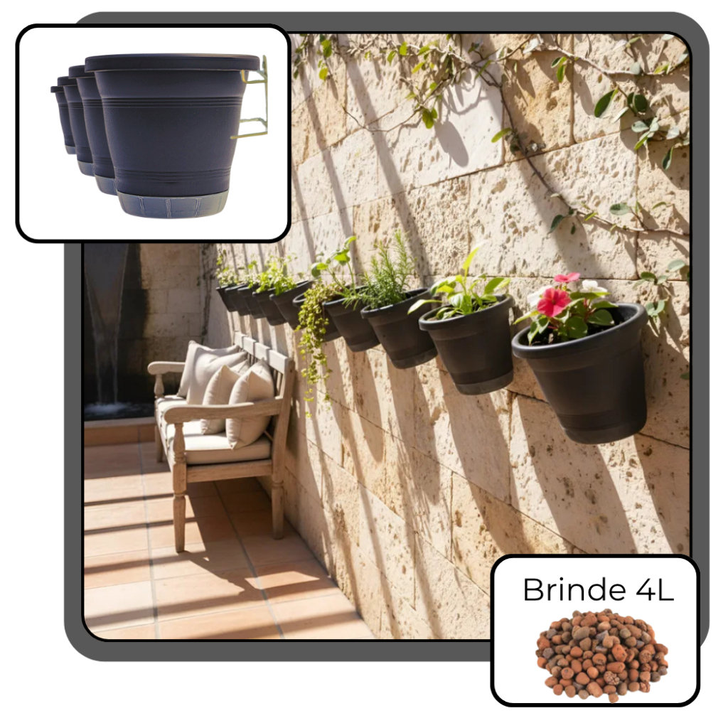 É o kit que possibilita retirar do chão aproveitar bem o espaço. Verticalizar e afinal quem gosta de plantas normalmente tem muitas . E otimizar os espaços É nosso diferencial. * VASO - Redondo, plástico, Texturizado, Elegante Moderno, *PRATO - "Anti Dengue" - o prato acopla-se perfeitamente ao vaso não deixando brechas para o mosquito Aedes aegypti; - Transparência - visualização do nível de água melhor contriole de regas para não faltar nem afogar as raízes. - Reservatório de água preserva os nutrientes não levados pela drenagem; - Possibilita espaçar as regas por dias; - Evita molhar o piso *SUPORTE DE PAREDE RETO - Dourado, em Aço com tratamento superficial para evitar a oxidação com um furo de fixação *CORDÃO - Auto irrigável pois conduz a água por capilaridade. *ARGILA EXPANDIDA -4 Litros para Camada de drenagem e/ou acabamento As plantas não fazem parte do kit Selecione a quantidade: "3", "5" ou "7" unidades vasos com prato e suportes Reto (SR) Medidas do vaso; 20,5 Boca, 18,5 Altura e Diâmetro da Base 13cm volume 3,2l Suporte Reto de metal zincado Garantia do vendedor: 30 dias