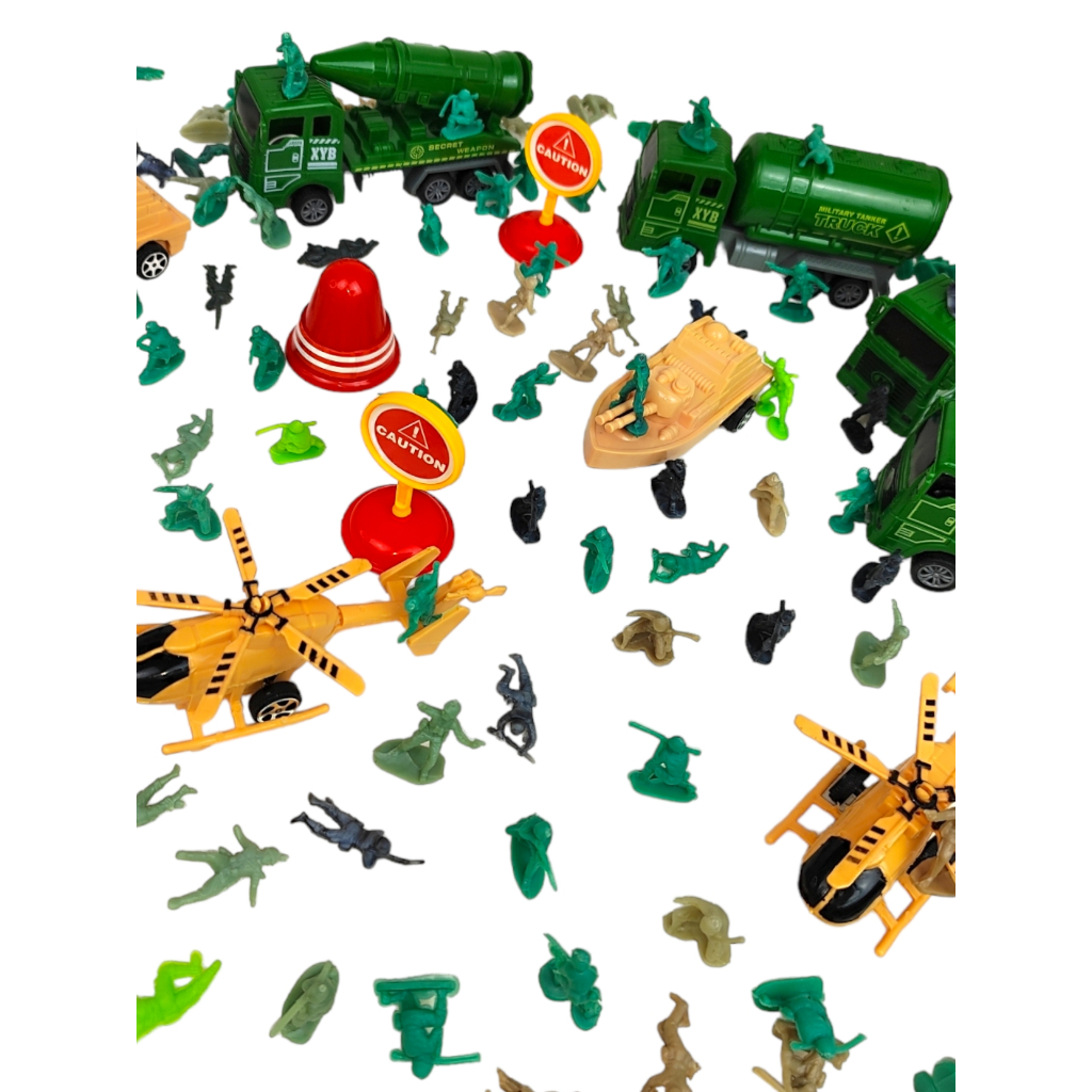 CONJUNTO CENÁRIO MILITAR PEÇAS EXERCITO TANQUE DE GUERRA AERONAVE! CONTÉM: 1 Kit Brinquedo Cenario Militar (peças sortidas) composto por: 2 Caminhões 1 Veículo sortido 1 Aeronave 10 Soldadinho Cenário sortido Com esse kit militar a brincadeira vai estar completa, despertando a imaginação das crianças. Produto ideal para presentear, usar em festas temáticas infantis, lembrancinhas, maquete, brindes, entre outras situações. Feito de plástico resistente, este conjunto é durável e seguro para as crianças brincarem. O kit militar cenário incluí diversos brinquedos militar, entre eles, tanque de guerra, aeronave, placas, mini truck, barcos, todos são enviados de forma sortida, sem a opção de escolha de modelo ou cor. Características; Produto: Kit Cenario Militar Cores: Sortidas Medidas: 33x23x5 Peso: 200g >> ATENÇÃO << Não personalizamos e nem fabricamos, todos os produtos vão sortidos, sem possibilidade de escolha de cor, modelo. >> RECOMENDAÇÕES << Quando utilizado para menores de 03 anos, deve haver supervisão de um adulto. Bolinha Magica, pequeno presente, GRANDE ALEGRIA!!