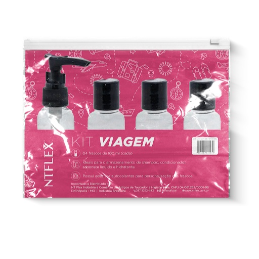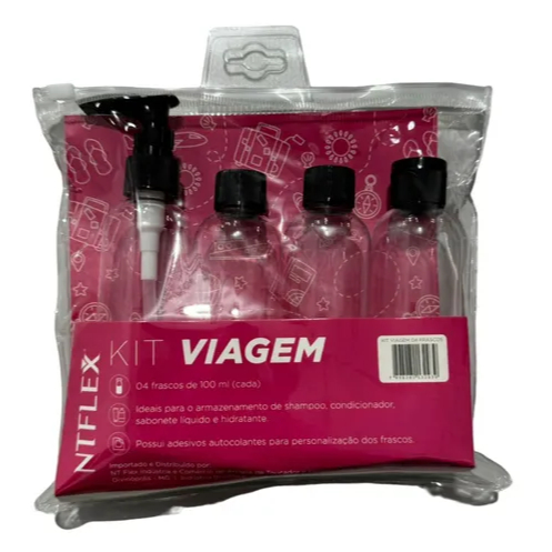 Kit Viagem Frascos Transparentes 100ml 4 Peças O kit viagem NTFLEX é um conjunto compacto e conveniente projetado para facilitar o transporte de produtos de higiene pessoal durante viagens. É prático para organizar os itens essenciais de higiene pessoal de forma compacta e segura, facilitando o transporte e Quatro frascos de 100 ml, resistentes e super fáceis de lavar; 2️⃣ Ideais para armazenar seu shampoo, condicionador, sabonete líquido e hidratante favoritos; 3️⃣ Acompanha um saquinho com fechamento ziplock, mantendo seus produtos de higiene sempre seguros; 4️⃣ Inclui adesivos autocolantes para personalizar os frascos e facilitar o uso, sem confusão! Deixe nosso KIT VIAGEM cuidar da sua organização enquanto você cuida de curtir a jornada! ✨🛫 Ver menosa utilização durante estadias fora de casa.