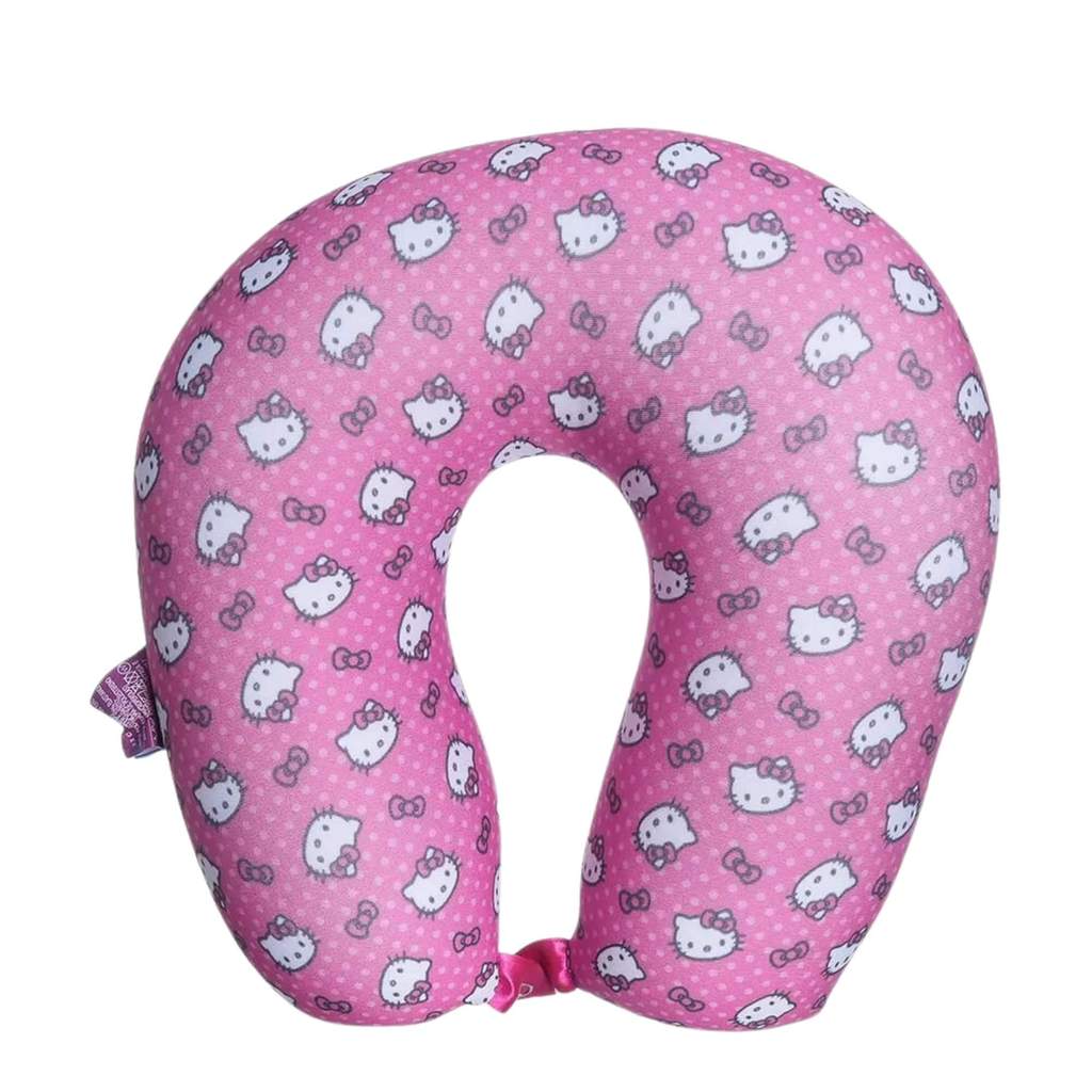 Kit Viagem Hello Kitty: Almofada Pescoço Micro Pérolas + Fone Sem Fio Earbuds com Adesivos