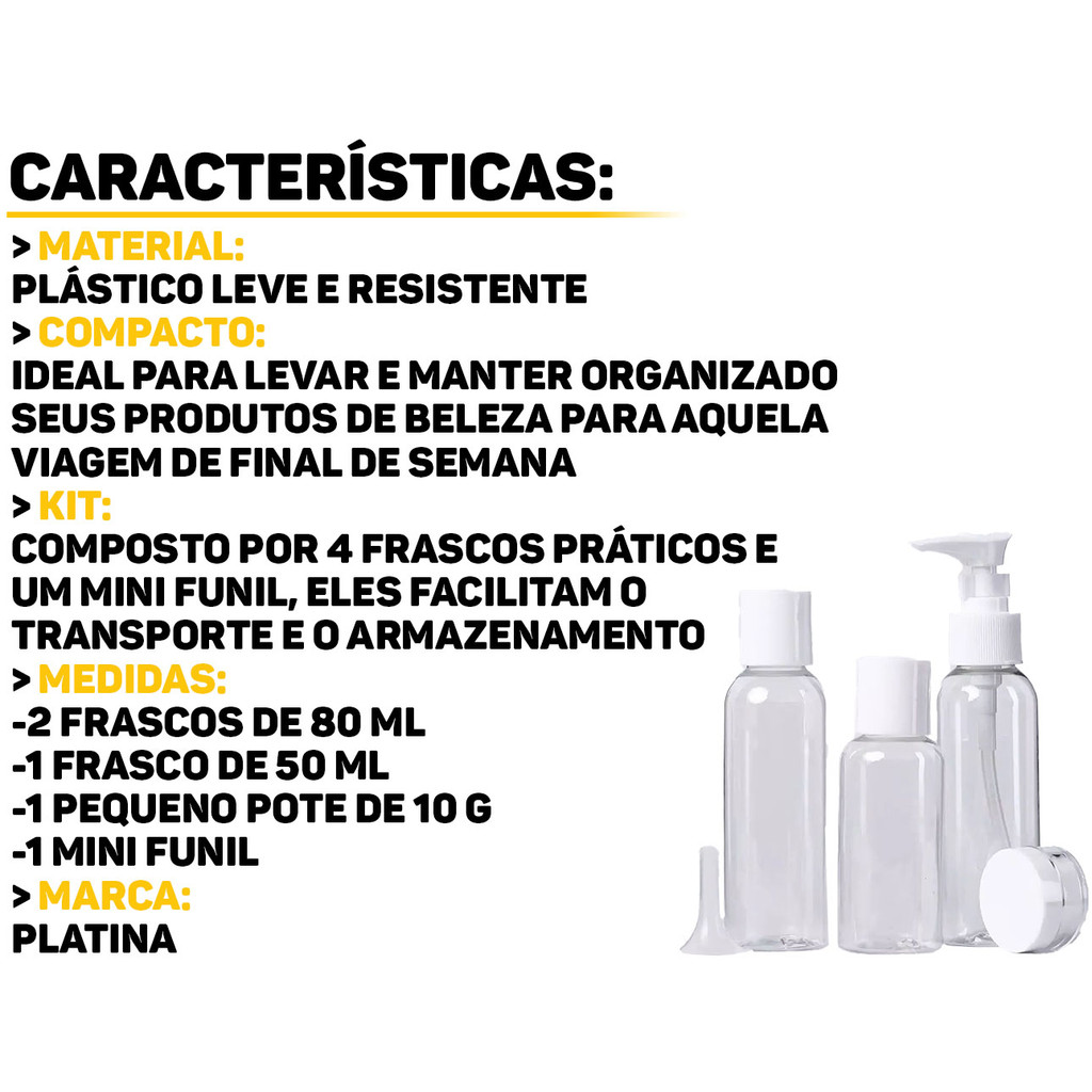 Kit Viagem 4 Frascos E Funil Plástico 50ml Platina O Kit Viagem da Platina é ideal para quem deseja organizar seus itens essenciais para viagens. Composto por três frascos de 50ml e um para hidratante, oferece praticidade para carregar seus cosméticos. Possui tamanho ideal para levar na bolsa, mochila ou mala, sem ocupar muito espaço. Características: > Possui necessaire transparente para armazenar os frascos; > Fechamento seguro que evita vazamentos e desperdício de produtos; > Plástico resistente, leve e durável, garantindo a proteção dos conteúdos. Especificações Técnicas: > Material: plástico; > O kit acompanha: - 1 mini funil; - 1 frasco de 50ml; - 2 frascos de 80ml; - 1 frasco pequeno de 10 gramas. - Marca: Platina - Garantia: 90 dias contra defeitos de fabricação Vantagens de comprar na Brester: - Produto a pronta entrega. - Produto novo, com garantia de fábrica. - Nota fiscal para Pessoa Física e Pessoa Jurídica.