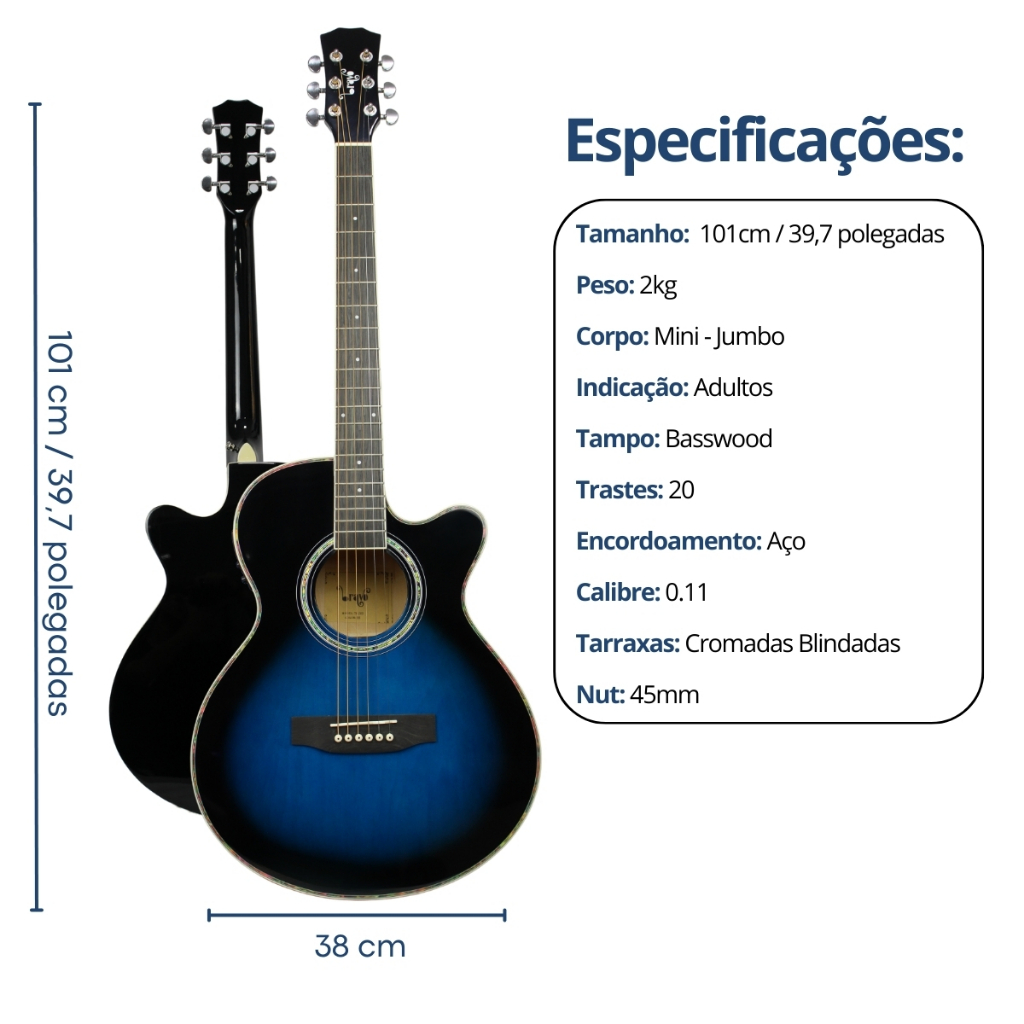 Itens inclusos: 1x Violão Elétrico Bravo Tf200 com Afinador Digital (Atenção: afinador embutido na lateral do violão) 1x Capa Violão Clássico Semi-Luxo 1x Correia Para Violão 1x Capotraste Violão c/ mola 2x Roldanas (instaladas) 1x Cabo P10 P10 Emborrachado 5m 1x Bateria 9v para o afinador / equalizador 3x Palhetas sortidas O Violão Elétrico Bravo TF200 da Série Tuneful oferece som de alta qualidade com construção em Basswood e cordas de aço, proporcionando uma projeção potente. O braço de Okoume com tensor bi-direcional garante ajuste confortável e preciso, enquanto o acabamento em verniz brilhante e as opções de cores destacam o estilo deste violão elétrico. Equipado com tarraxas cromadas para afinação precisa, o produto acompanha uma capa semi-luxo acolchoada para maior proteção. Tampo: Basswood Fundo e laterais: Basswood Escala e cavalete: Madeira técnica Cordas: Aço Braço: Okoume com tensor bi-direcional Tarraxas: Cromadas Capa: Semi-luxo Acolchoada Acabamento: Verniz brilhante Encordoamento: Calibre .011 Escolha sua cor: Sunburst, Black, Red Burst, Blue Burst, Black. Headstock: Logo Bravo na cor branco Medidas: Comprimento da escala: 465 mm Largura da caixa: 380 mm Altura da caixa: 100 mm Largura do rastilho: 73 mm Largura da pestana: 43 mm Tamanho total: 102 cm Produto 100% original com garantia em todo o país.
