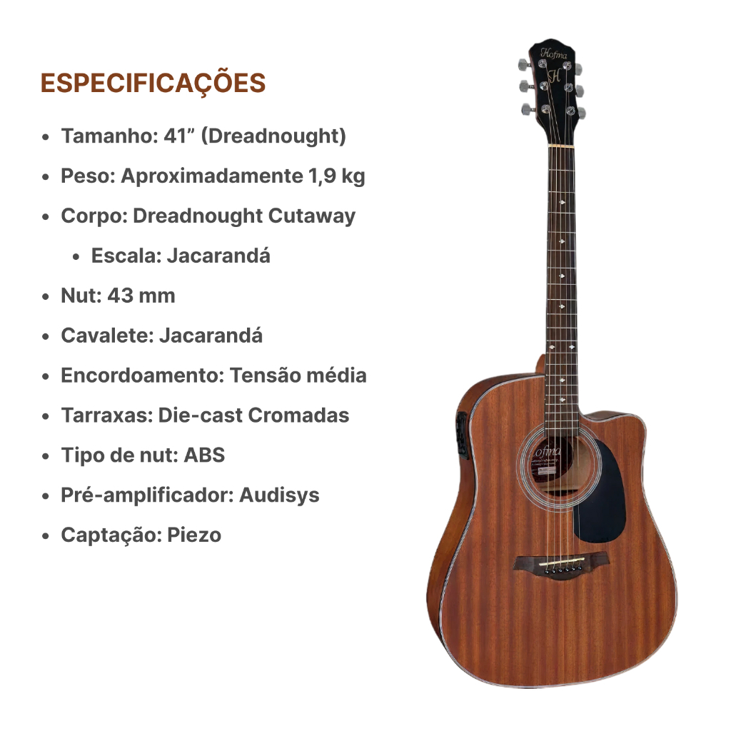 Kit Violao Hofma Hmf250 Stnt Folk + Acessórios Itens inclusos: 1x Capa Para Violão Tamanho Folk 1x Correia 5cm para instrumentos (Violão, Guitarra, Contra Baixo e etc) 1x Capotraste para Violão / Guitarra 1x Cabo P10 P10 5m 3x Palhetas sortidas 1x Roldana Violão Hofma Hmf250 Stnt Folk Modelo Folk para quem deseja um instrumento com um visual exótico por ter uma caixa de ressonância confeccionada em Sapele, também conhecida como mogno africano. Boa pegada, excelente acabamento acetinado e volume são os principais destaques do HMF 250. Possui circuito de captação ativo equipado com equalizador de 5 bandas e um prático afinador digital com visor de LCD para garantir o melhor som plugado. Características: Tampo (Top): Sapele Lateral e Fundo (Back & Side): Sapele Escala e Cavalete (Fingerboard & Bridge): Jacarandá (Rosewood) Braço (Neck): Mogno Oriental (Nato) Roseta (Rosette): Mosaico Trastes (Frets): 20 em Alpaca Tarraxas (Tuning Machines): Die-cast Cromadas Cordas (Strings): Aço DAddario Sistema de captação (Pickup & Preamp): Piezo Equalizador: Hofma AUDISYS Marcação (Inlay): Diamond Acabamento (Finish): Acetinado Produto 100% original, importado e distribuído por Golden (importadora oficial Hofma) com garantia em todo território nacional. ----------------------------------- Perguntas Frequentes: - Quem somos? A Top Music Instrumentos Musicais está há mais de 19anos no mercado.Temos a missão de garantir satisfação total de nossos clientes, tanto nos produtos vendidos quanto no atendimento prestado. Somos Mercado Líder, estamos entre os melhores vendedores do Mercado Livre e possuímos um excelente índice de satisfação. Compre com quem entende de música! - Pronta entrega? Todos nossos produtos estão disponíveis e serão postados no mesmo dia caso sua compra seja aprovada até as 12:00. O envio é feito através de transportadoras parceiras do Mercado Livre, a entrega mais rápida do Brasil! O frete pode ser calculado diretamente no anúncio, logo abaixo do preço. - É original, tem garantia? Sim! Todos nossos produtos são originais, novos, com garantia e Nota Fiscal. Qualquer problema de fabricação, entre em contato através do campo de mensagens. - Posso retirar o produto ? Sim! Temos loja física e está localizada no Centro de Vitória - ES. Ao finalizar a compra selecione a opção de retirada somente se tiver disponibilidade de retirar em nosso estabelecimento. - Como realizo o pagamento? Pode realizar através dos meios que o Mercado Pago oferece. É rápido, seguro e não tem custo adicional, além de dar como opção as principais bandeiras de cartão. - Posso devolver ou trocar o produto? O produto pode ser devolvido em até 7 dias, desde que esteja em sua embalagem original, sem sinais de uso e nenhum lacre violado.
