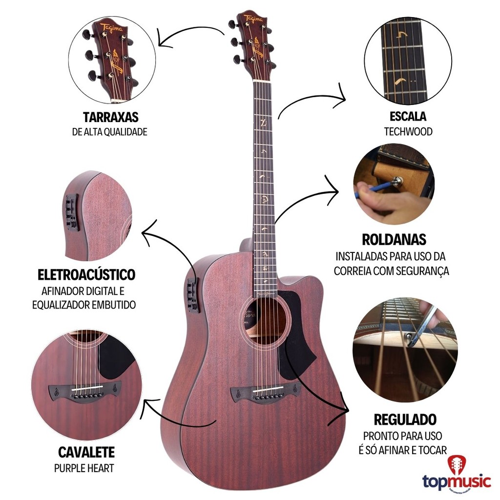 Violão Tagima Elétrico Juninho Afram Gran Reserva Aço Cutaway Apresentamos o Kit Violão Tagima Juninho Afram Gran Reserva, completo e pronto para você evoluir na música com estilo, praticidade e performance. Ideal para iniciantes exigentes ou músicos experientes que buscam um conjunto completo. O violão eletroacústico conta com corpo Folk Cutaway, tampo em Sapele e braço em Okoume, oferecendo som encorpado e confortável de tocar. Equipado com pré Tagima TEQ-8 e captação Piezo, é perfeito para palco ou estúdio. O kit inclui capa semi luxo, capotraste tipo braçadeira, correia, palheta e cabo P10 de 5 metros - tudo o que você precisa para começar a tocar já. Design moderno, acabamento fosco e tarraxas pretas completam a pegada profissional do instrumento. Especificações: Modelo: Juninho Afram Tipo: Violão Eletroacústico Acabamento: Fosco Formato do Corpo: Folk Com Cutaway Encordoamento: Aço Número de Cordas: 6 Madeira de Braço: Okoume Madeira de Tampo: Sapele Madeira da Lateral: Sapele Madeira de Fundo: Sapele Cavalete: Purple Heart Escala: Techwood- C 25.5" Nut (Capo Traste): 43mm Número de Trastes: 20 Tarraxas: Pretas Escudo: Black Utilização/Mão: Destro Pré: Tagima TEQ-8 Captação: Piezo Medidas do instrumento: Escala - 46 cm Comprimento do corpo - 50 cm Largura do corpo - 39 cm Profundidade do corpo: 12 cm Itens Inclusos: - 1x Violão Tagima Elétrico Juninho Afram Gran Reserva Aço Cutaway - 1x Capa Violao Classico Semi Luxo - 1x Capotraste Braçadeira Para Violão Music - 1x Correia Violão Guitarra Baixo 5cm Castanho - 3x Palheta Sortida Violao Guitarra - 1x Cabo P10 P10 Emborrachado 5m Produto 100% original com garantia em todo país.