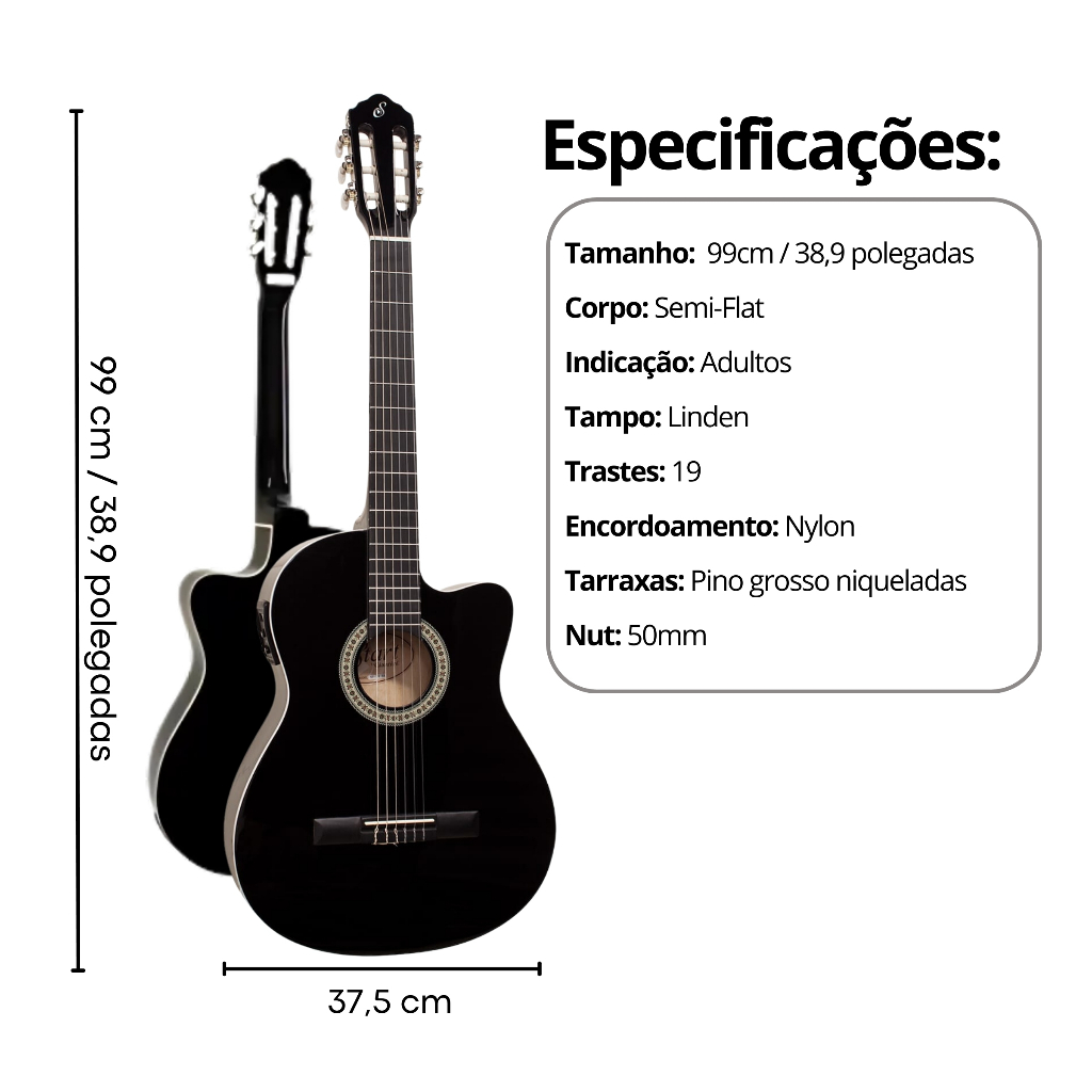 Itens inclusos no kit: 1x Violão Giannini Elétrico NF14 Natural 1x Capa Simples Violão com bolso frontal 1x Correia Violão Basso NY01 1x Capotraste Violão com mola 1x Cabo Datalink POP 5m 2x Roldana cromadas (instaladas) 3x Palheta sortidas O Violão Giannini Start NF-14 é um violão leve, macio para tocar, confortável e de boa qualidade. Um violão ideal para quem quer aprender a tocar e vai encarar horas de estudo do instrumento. Além disso, o violão também é excelente para quem já toca e quer um instrumento leve para deixar no carro, levar para cima e para baixo, animar as rodas de amigos, tocar suas músicas em casa, ou qualquer lugar que você vá. O Giannini NF-14 é perfeito para dar o "Start" na sua vida musical. Aproveite! Especificações: Modelo: Violão Flat Cutaway Eletroacústico Nylon Categoria: Eletroacústico Shape: Flat Série: Start Nº de Cordas: 6 Cordas Tampo: Linden Faixa e fundo: Linden Braço: Catalpa com Tensor Bi-Direcional Escala: Maple Escurecido (Dark Maple) Marcação: Bolinhas Brancas Tarraxas: Clássicas Niqueladas com botões Perolados Captador: Rastilho Equalizador: 3 bandas - pré-amplificador ativo com afinador cromático Saída: P-10 Acabamento: Verniz brilhante Cores: Natural e Preto - escolha a sua Produto 100% original com garantia em todo território nacional.