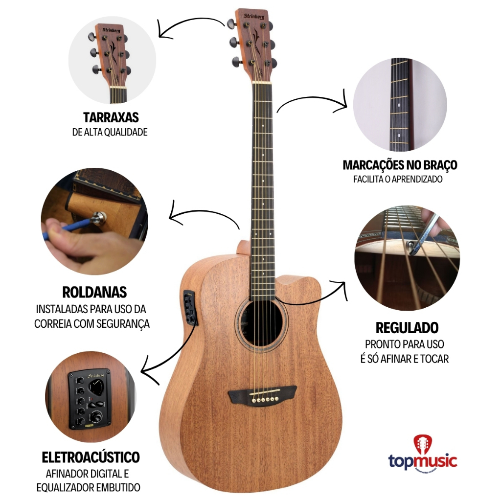Esse kit foi montado com acessórios de alta qualidade, selecionados para o seu violão. Conosco você adquire kits de alta qualidade e preço justo. Itens do kit: 1x Violão Folk Eletroacústico Strinberg FS4D 1x Capa Acolchoada Violão Folk 1x Correia para Violão 1x Capotraste para Violão de Metal 1x Cabo P10 5m 3x Palhetas sortidas Violão Strinberg Folk da série Forest o FS4D conta com um visual deslumbrante e sem igual. Excelente sonoridade, pré-amplificador SE50, com controle e afinador digital. Violão para quem tem estilo! Especificações: Tipo: Violão Eletroacústico Acabamento: Fosco (Satin) Formato do Corpo: Folk com Cutaway Encordoamento: Aço - Espessura .011 / .048 Número de Cordas: 6 Madeira de Braço: Nato Madeira de Tampo: Sapele Laminado Madeira da Lateral: Sapele Laminado Madeira de Fundo: Sapele Laminado Cavalete: Rosewood Escala: Technical Wood Tensor: Sim. Bilateral Nut (Capo Traste): 43mm Número de Trastes: 20 Marcações: Dots Tarraxas: Blindadas Pretas Escudo: N/A Empunhadura / Mão: Destro Pré: SE-50 Captação: Piezo Alimentação: Bateria 9V Jack: P10 e XLR (Balanceada) Produto 100% original com garantia em todo país.