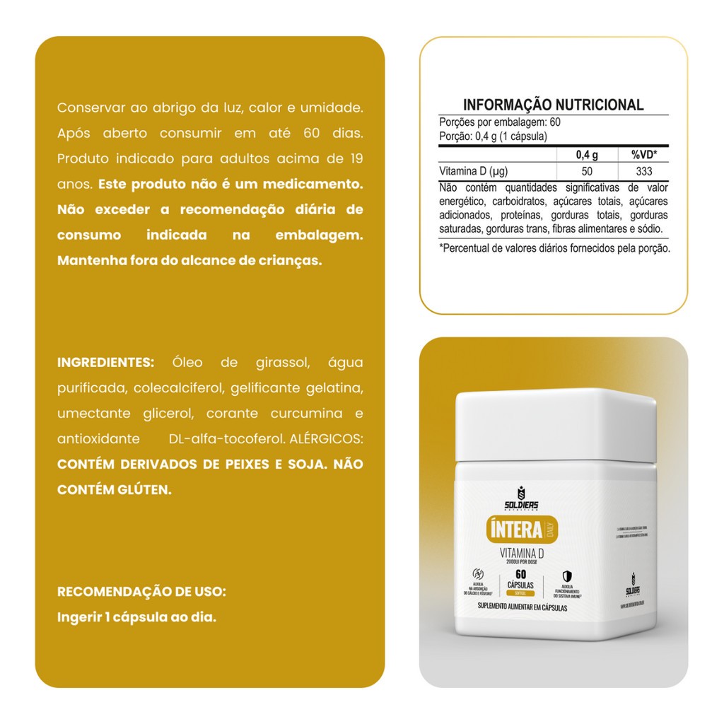 Kit: Vitamina D + Ômega 3 E Coenzima Q10 Imunidade Coração Intera Daily Suplemento Alimentar de Vitamina D3 em Cápsulas Principais beneficios: Vitamina D3 auxilia na formação de ossos e dentes, na absorção de cálcio e fósforo, no funcionamento do sistema imune e muscular, além de ajudar na manutenção dos níveis de cálcio no sangue e na divisão celular. Fonte rica em vitamina D. RECOMENDAÇÃO DE USO: Ingerir 1 cápsula ao dia. INGREDIENTES: Óleo de girassol, água purificada, colecalciferol, gelificante gelatina, umectante glicerol, corante curcumina e antioxidante DL-alfa-tocoferol. ALÉRGICOS: Pode conter soja, leite, peixes, ovos, amendoim, amêndoa, avelãs, castanha-de-caju, castanha-do-pará, macadâmias, nozes, pecãs, pistaches, pinoli, castanhas, crustáceos (krill e caranguejo), trigo, centeio, cevada, aveia e suas estirpes hibridizadas e seus derivados. Contém glúten Não contém quantidades significativas de valor energético, carboidratos, açúcares totais, açúcares adicionados, proteínas, gorduras totais, gorduras saturadas, gorduras trans, fibras alimentares e sódio. Suplemento Alimentar de óleo de Peixe com Coenzima Q10 em Cápsulas Principais beneficios: Fonte rica em ômega 3, que auxilia na saúde cardiovascular e no funcionamento do organismo. contém coenzima q10, que contribui para a proteção antioxidante e energia celular. RECOMENDAÇÃO DE USO: Ingerir 2 cápsulas ao dia. INGREDIENTES: Óleo de peixe, água purificada, coenzima Q10, gelificante gelatina, umectante glicerol, emulsificante lecitina, corante amarelo crepúsculo e antioxidante mistura concentrada de tocoferóis. ALÉRGICOS: Contém derivados de peixe e soja e pode conter leite, ovos, amendoim, amêndoa, avelãs, castanha-de-caju, castanha-do-pará, macadâmias, nozes, pecãs, pistaches, pinoli, castanhas, crustáceos (krill e caranguejo), trigo, centeio, cevada Não contém quantidades significativas de carboidratos, açúcares totais, açúcares adicionados, proteínas, fibras alimentares e sódio.
