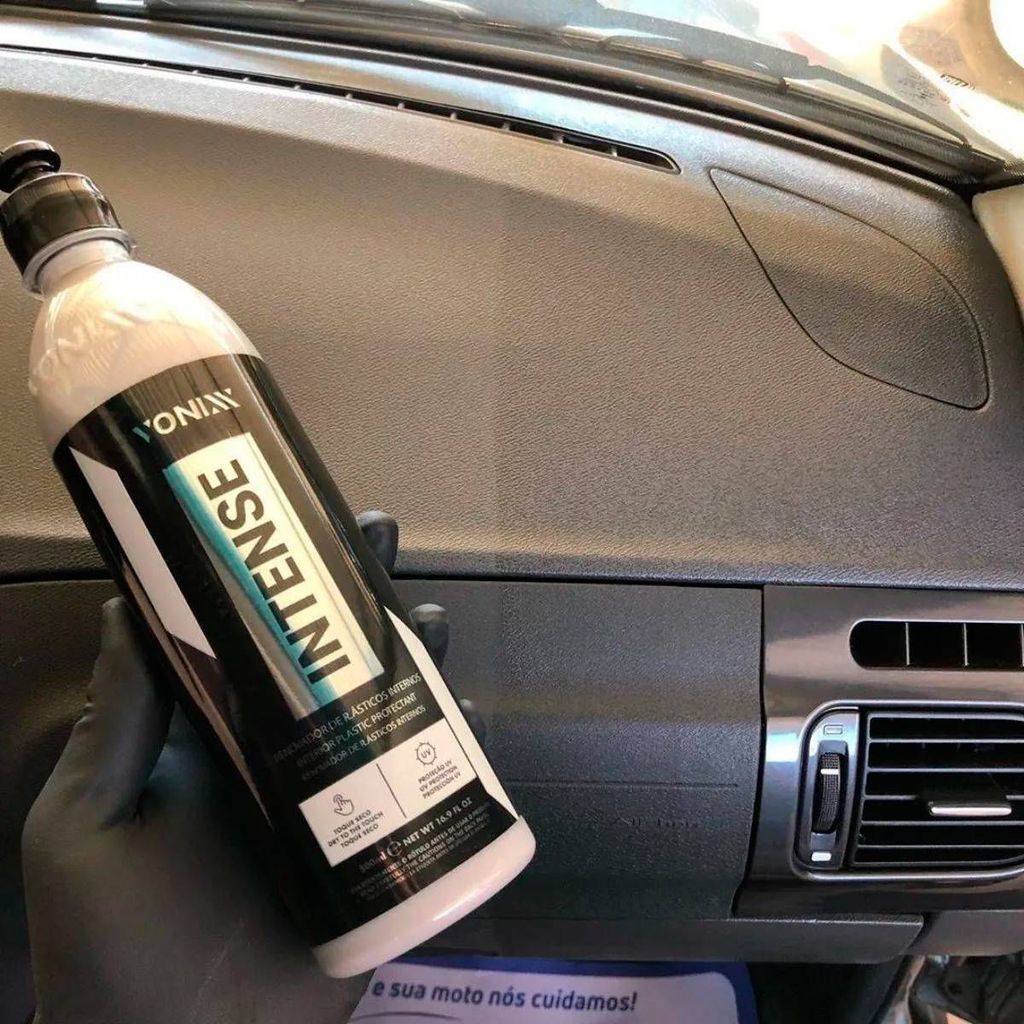 KIT AUTOMOTIVO VONIXX: LIMPEZA E HIDRATAÇÃO DOS PLÁSTICOS - SINTRA FAST 500ML – LIMPEZA INTERNA DE VEÍCULOS 1,5L - INTENSE 500ML DESCRIÇÃO LIMPADOR BACTERICIDA SINTRA - LIMPEZA DE PAINÉIS - LATERAIS E CANTOS DE PORTAS - CARPETES E ESTOFADOS. Sintra Fast é um multilimpador flotador universal, bactericida e germicida de pH balanceado, indicado para limpeza de painéis, laterais e cantos de portas, bancadas de couro, carpetes e estofados. Promove alto poder de remoção de manchas de gordura e sujeiras diversas, além de eliminar microrganismos causadores de doenças no interior do veículo. Sintra Fast diminui maus odores no interior do veículo, tornando-o mais saudável e livre de impurezas. MODO DE USO: Em painéis, laterais, cantos de portas e bancos de couro: - Pulverizar o produto na superfície a ser limpa e desinfetada. - Utilizar pincel, escova macia ou aplicador de espuma e realizar movimentos circulares até observar o desprendimento total da sujeira. - Remover o excesso com auxílio de toalha de microfibra úmida. - Secar em seguida com uma toalha de microfibra limpa e seca. --------------------------------------------------------------------------------------------- INTENSE 500ML VONIXX RENOVADOR DE PLÁSTICOS AUTOMOTIVOS INTERNOS INTENSE é um renovador de plásticos com proteção UV, cuja fórmula balanceada promove acabamento natural e toque seco, com durabilidade de 6 meses. O produto deve ser utilizado especificamente na parte interna do automóvel, em superfícies como vinil e plásticos em geral. DILUIÇÃO Pronto uso. DURABILIDADE Até seis meses de proteção nos plásticos internos. INFORMAÇÕES ADICIONAIS Intense pode ser utilizado em painéis soft touch. Não recomendamos o uso do produto em plásticos externos e em couro. TOQUE SECO PROTEÇÃO UV DISPONÍVEL EM: 500 ML MODO DE USO: Certifique-se que a superfície esteja limpa e seca; Aplique uma pequena quantidade de produto de maneira uniforme com o auxílio de um aplicador de microfibra; Espalhe bem até o total preenchimento da peça. Obs. Se necessário, repita a operação; qualquer mancha ou excesso poderá ser removido com uma toalha de microfibra limpa e seca.