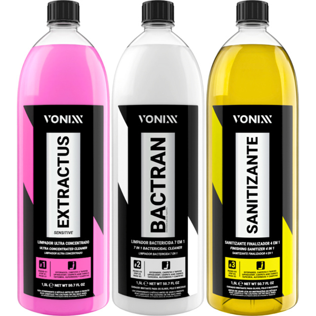 Kit VSC Vonixx Limpeza Veicular de Estofados e Carpetes 1,5L Extractus Sensitive Bactran Sanitizante