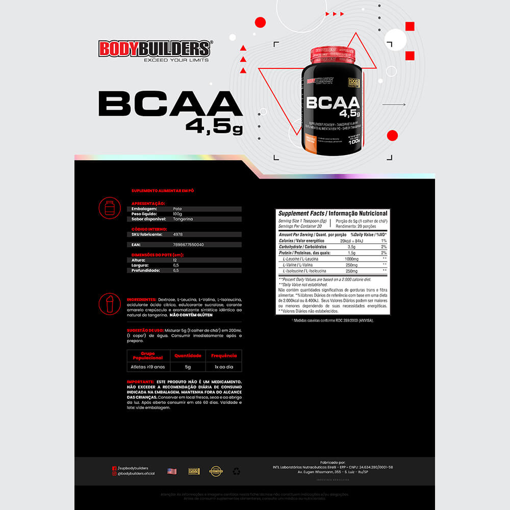 KIT Bodybuilders composto por: Kit Waxy Whey Protein 900g + BCAA 4.5 100 gr + Power Creatine 100g – Bodybuilders Whey Proten Waxy Whey: 1 unidade de 2kg a) possui em sua formulação a proteína concentrada do soro do leite (WPC), uma proteína de alto valor biológico, rica em BCAA's b) Potencializa o aumento e a força dos feixes musculares quando associada a um programa de exercícios físicos BCAA 4.5 : 1 pote com 100 gr a) é um suplemento alimentar composto pelos 3 aminoácidos essenciais de cadeia ramificada, L-Leucina, L-Isoleucina e L-Valina b) auxilia na diminuição das dores musculares e fadiga, gerando assim maior energia e força para execução dos exercícios. Power Creatina: 1 unidade de 100g a) é formada a partir da associação de 3 aminoácidos de alto valor biológico: arginina, glicina e metionina. b) é usada pelo tecido muscular para a produção de fosfocreatina, fator importante na formação de adenosina trifosfato (ATP), que funciona como um repositor de energia. Observação antes do consumo: a) Leia a embalagem com todas as informações do produto, como tabela nutricional, ingredientes e a sua indicação p/ consumo. b) Kit para ganho de massa muscular e deve ser consumido sob orientação de um profissional da área.