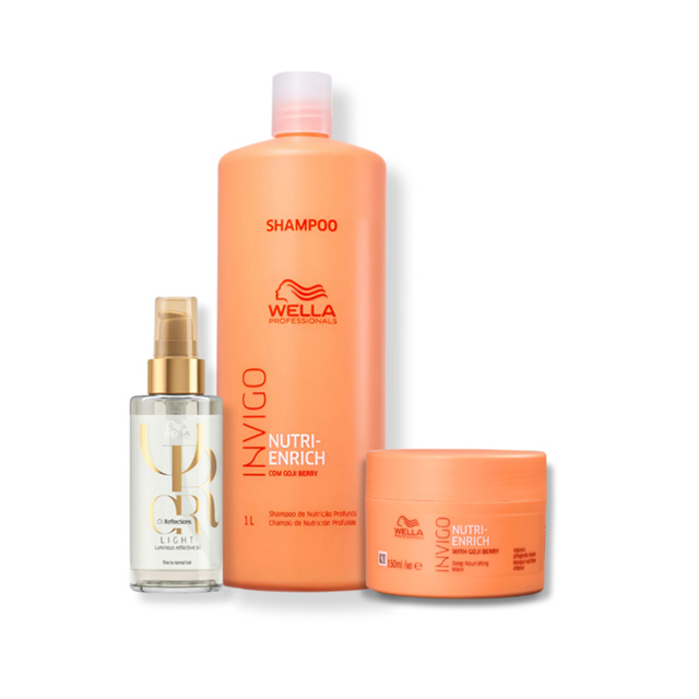Kit Wella Professionals Invigo Nutri-Enrich - Shampoo 1L, Máscara 150ml e Óleo Light 100ml Benefícios: Nutrição leve; Brilho natural; Fios soltos e macios; Contém: Wella Professionals Invigo Nutri-Enrich Shampoo 1L Wella Professionals Invigo Nutri-Enrich Máscara 150ml Wella Professionals Oil Reflections Óleo Light 100ml Clientes dizem: “Meu cabelo ficou nutrido e com brilho leve e natural.” “O óleo é perfeito para fios finos, não pesa.” “Kit completo, deixa o cabelo hidratado e sedoso.”