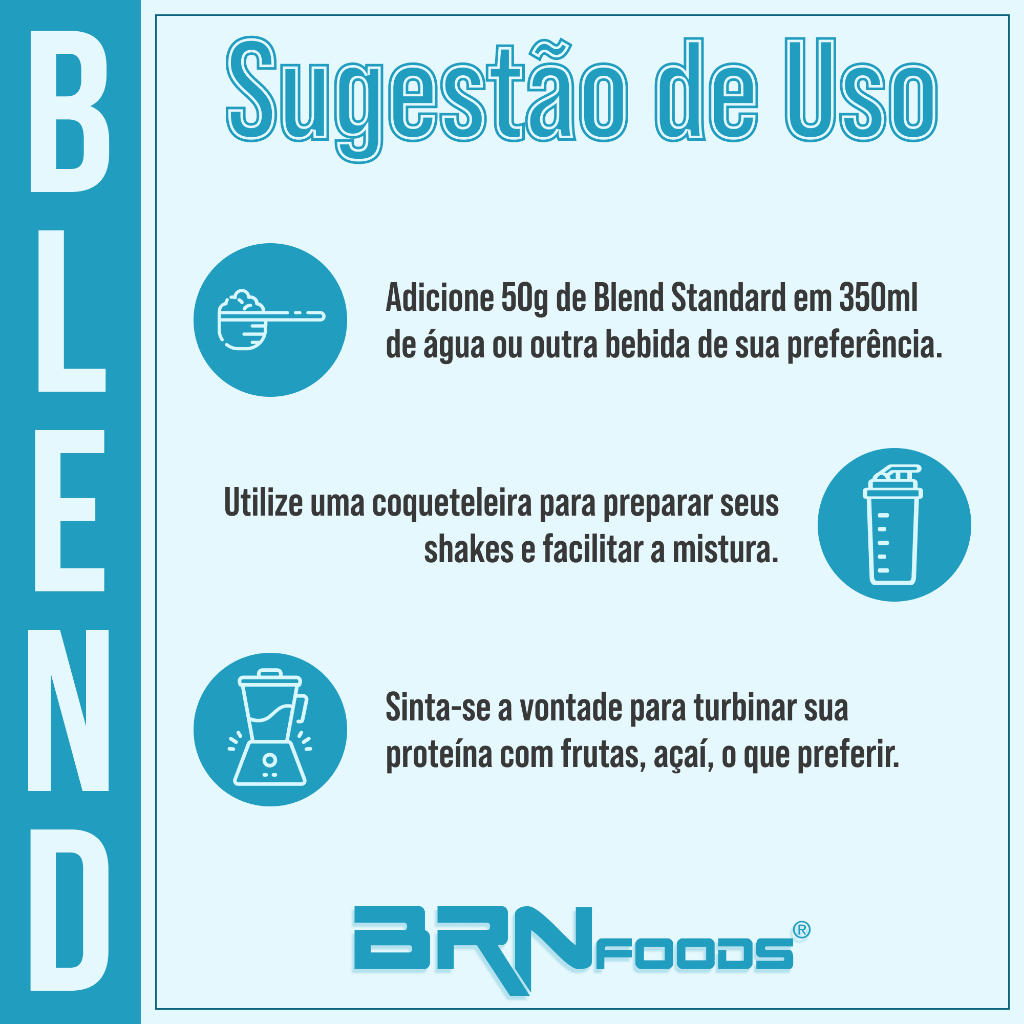 Kit BRN Foods – Whey Blend 2kg + Creatina Premium 300g + BCAA 60 cápsulas + Cafeína 8 Hours Suplementos alimentares em pó e cápsulas, desenvolvidos para complementar sua rotina de treinos com praticidade. Whey Protein Blend Standard 2kg Porção de 50 g (5 colheres de sopa) • Valor energético: 187 kcal • Proteínas: 17 g • Carboidratos: 28 g • Gorduras totais: 0,6 g • Sódio: 121 mg Ingredientes: Proteínas do soro do leite, maltodextrina, aromatizante, espessantes e edulcorantes. Premium Creatina 300g – Sabor Tangerina Porção de 10 g (1 colher de sopa) • Valor energético: 42 kcal • Creatina: 3.000 mg • Carboidratos: 7 g Ingredientes: Creatina monoidratada em pó, amilopectina, maltodextrina, corante amarelo crepúsculo e aroma. Premium BCAA 60 cápsulas Porção de 1,7 g (4 cápsulas) • Valor energético: 4 kcal • Proteínas: 1 g • L-Leucina: 360 mg • L-Isoleucina: 268 mg • L-Valina: 264 mg Ingredientes: L-Leucina, L-Isoleucina, L-Valina, amido de milho, antiumectante, gelatina e água purificada. 8 Hours Cafeína 60 cápsulas Porção de 0,5 g (1 cápsula) • Valor energético: 0 kcal • Cafeína: 320 mg Ingredientes: Cafeína anidra, geleificante e água purificada. Modo de uso sugerido: Seguir orientação do médico ou nutricionista. Atenção: Este produto não substitui uma alimentação equilibrada. Consulte um profissional de saúde antes de utilizar.