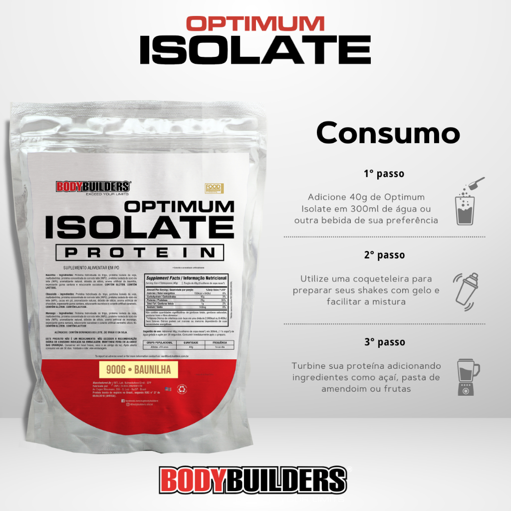Você está comprometido em atingir seus objetivos de condicionamento físico e deseja elevar seu desempenho a um novo patamar, o suplemento Optimum Isolate é a chave para o sucesso. Esta fórmula de whey isolado exclusiva é uma verdadeira revolução no mundo dos suplementos esportivos! ➡️OPTIMUM ISOLATE WHEY PROTEIN: ⚡É um suplemento alimentar formulado com um blend das mais nobres proteínas disponíveis como: proteína isolada de soro de leite, proteína hidrolisada do trigo, caseína, proteína isolada da soja e albumina, com diferentes tempos de absorção pelo organismo garantindo assim uma adequada ingestão proteica, ajudando a construir um corpo mais forte e definido. OPTIMUM ISOLATE é rico em BCAAs e outros aminoácidos essenciais que podem proporcionar mais energia e força, garantindo um melhor desempenho, para auxiliar no volume e definição muscular! ➡️Por que tomar a OPTIMUM ISOLATE PROTEIN? ⚡Se você estiver seguindo alguma rotina de exercícios, seja com base em pesos, cardio ou treino de resistência, então você poderá se beneficiar com a ingestão de mais proteína. A Optimum Isolate Protein oferece uma maneira rápida e fácil de aumentar sua ingestão diária, especialmente após a sessão de treino, quando você pode não estar disponível a cozinhar e comer uma refeição completa. Mas lembre-se: os suplementos são projetados para preencher as lacunas nutricionais de uma dieta completa e variada. O caminho indicado é o de que se obtenha a maioria de suas proteínas diárias de carne e peixe vermelhos e brancos, porque você também consumirá as vitaminas, minerais e outros nutrientes essenciais para a saúde ideal. -------------------------------------------------------------------------------------------------------------------------------------------------------------------------------------------------------- ➡️SUGESTÃO DE CONSUMO: ⚡Adicionar 40g (4 colheres de sopa rasas) em 300mL (1 ½ copo) de água gelada e agite por 20 segundos. Consumir imediatamente após o preparo. ➡️NOTA: ⚡Consulte sempre um profissional de saúde antes de iniciar qualquer novo regime de suplementação. Este kit não substitui uma dieta equilibrada e um programa de treinamento adequado!