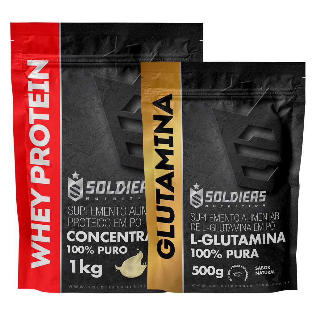 Kit: Whey Protein Concentrado 1Kg + Glutamina 500g - 100% Importado - Soldiers NutritionESTE KIT CONTÉM OS SEGUINTES ITENS:- Whey Protein Concentrado 1Kg- Glutamina 500gWhey Protein Concentrado 1Kg - 100% Importado - Soldiers NutritionMatéria-prima importadaPRODUTO COM LAUDO DE FABRICAÇÃOBENEFÍCIOS DO WHEY PROTEIN:- Combinação de aminoácidos fundamentais para um desempenho superior- Resposta mais rápida e eficaz das células e hormônios do organismo- Otimização do crescimento muscular- Papel antioxidante- Manutenção do sistema imunológico- Favorecimento da reparação muscular após o treinamentoSABORES: Chocolate Belga - Morango - Baunilha - Moccacino - NaturalO whey protein concentrado é um dos suplementos mais necessários para quem pratica musculação. Ele contém ótima quantidade de proteinas e demais ingredientes essenciais para o crescimento muscular. A combinação de aminoácidos é um fator muito importante para o ótimo desempenho.Glutamina 500g - 100% Pura Importada - Soldiers NutritionAcompanha Colher Dosadora 5gBENEFÍCIOS DA GLUTAMINA:- Controla o processo de anabolismo e catabolismo;- Removo os excessos de amônia e nitrogênio do corpo;- Regula a síntese e degradação de proteínas;- Regulação do sistema imune.A glutamina participa de forma relevante na síntese de outros aminoácidos e ajuda a manter a homeostase dos tecidos durante o processo de catabolismo. Outras funções importantes inerentes à glutamina é o fato dela conseguir liberar quantidades extras de hormônios na corrente sanguínea, como por exemplo, a testosterona.SOMOS FABRICANTES, PRODUTO DIRETO DA FÁBRICA PARA VOCÊ COM TOTAL GARANTIA DE QUALIDADEANVISA:Registro ISENTO conforme resolução RDC 27 de 06 de agosto de 2010 anexo I.Registro ISENTO conforme resolução RDC 240/2018.