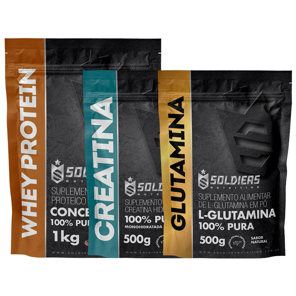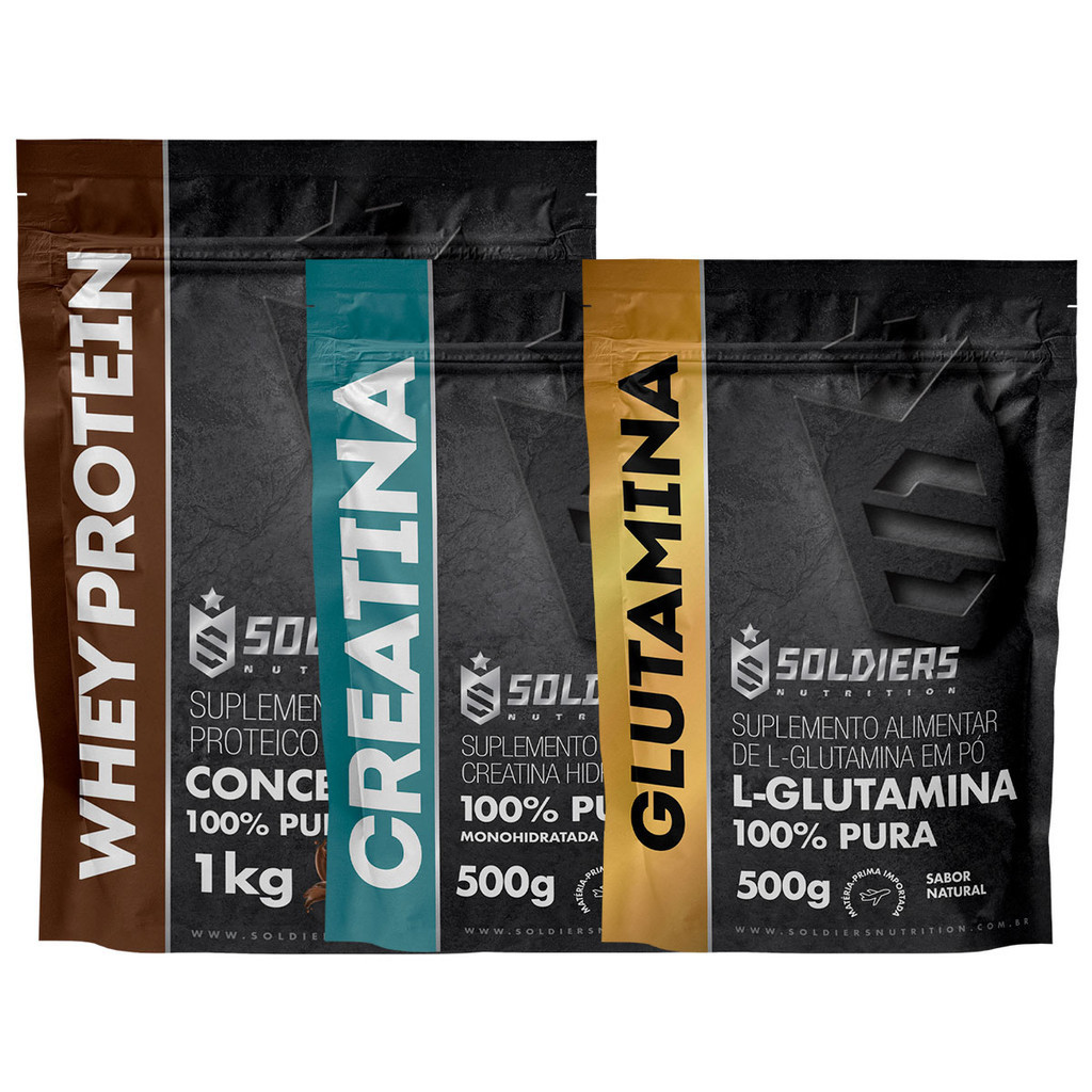 Kit: Whey Protein Concentrado 2Kg + Creatina Monohidratada 500g + Glutamina 500g - 100% Importado - Soldiers NutritionESTE KIT CONTÉM OS SEGUINTES ITENS:- Whey Protein Concentrado 2Kg;- Creatina Monohidratada 500g;- Glutamina 500gWhey Protein Concentrado 2Kg - 100% Importado - Soldiers NutritionMatéria-prima importadaPRODUTO COM LAUDO DE FABRICAÇÃOBENEFÍCIOS DO WHEY PROTEIN:- Combinação de aminoácidos fundamentais para um desempenho superior- Resposta mais rápida e eficaz das células e hormônios do organismo- Otimização do crescimento muscular- Papel antioxidante- Manutenção do sistema imunológico- Favorecimento da reparação muscular após o treinamentoSABORES: Chocolate Belga - Morango - Baunilha - Moccacino - NaturalO whey protein concentrado é um dos suplementos mais necessários para quem pratica musculação. Ele contém ótima quantidade de proteinas e demais ingredientes essenciais para o crescimento muscular. A combinação de aminoácidos é um fator muito importante para o ótimo desempenho.Creatina Monohidratada 500g - 100% Pura Importada - Soldiers NutritionAcompanha Colher Dosadora 3gBENEFÍCIOS DA CREATINA:- Aumenta a capacidade do músculo de gerar força;- Aumento de massa magra;- Aumento da capacidade de treinamento;- Previne o catabolismo muscular;A creatina é um derivado de aminoácidos obtida através da dieta de síntese por nosso próprio organismo. Ela está presente essencialmente no músculo e auxilia na manutenção dos níveis de energia durante períodos breves de exercício intenso. Ou seja, sua função é crucial nos treinos com muito peso na busca pelo ganho de massa.Glutamina 500g - 100% Pura Importada - Soldiers NutritionAcompanha Colher Dosadora 5gBENEFÍCIOS DA GLUTAMINA:- Controla o processo de anabolismo e catabolismo;- Removo os excessos de amônia e nitrogênio do corpo;- Regula a síntese e degradação de proteínas;- Regulação do sistema imune.A glutamina participa de forma relevante na síntese de outros aminoácidos e ajuda a manter a homeostase dos tecidos durante o processo de catabolismo. Outras funções importantes inerentes à glutamina é o fato dela conseguir liberar quantidades extras de hormônios na corrente sanguínea, como por exemplo, a testosterona.SOMOS FABRICANTES, PRODUTO DIRETO DA FÁBRICA PARA VOCÊ COM TOTAL GARANTIA DE QUALIDADEANVISA:Registro ISENTO conforme resolução RDC 27 de 06 de agosto de 2010 anexo I.Registro ISENTO conforme resolução RDC 240/2018.