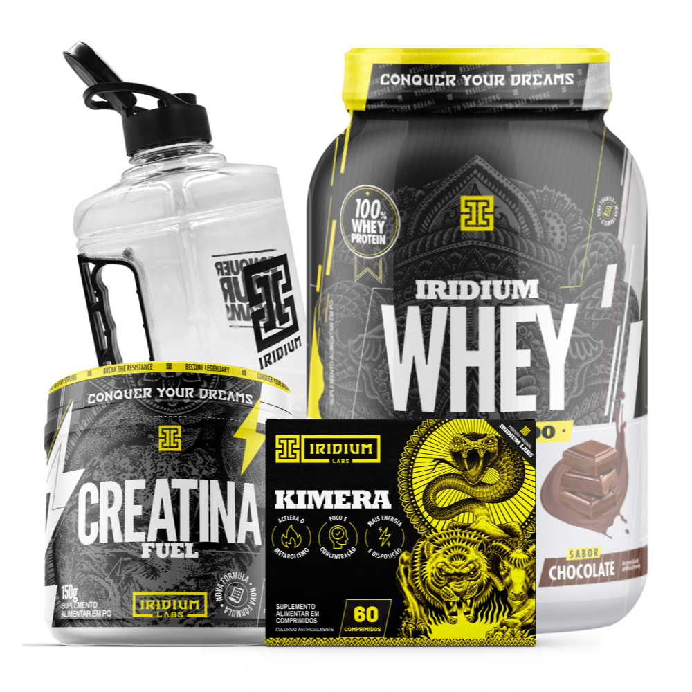Whey Protein Concentrado 900g - Iridium Labs O Iridium Whey é o suplemento de proteína da Iridium Labs, fabricado com as melhores matérias-primas existentes no mercado. O whey protein é uma proteína extraída do soro do leite no momento em que é realizado o processo de transformação de leite em queijo, por isso, contém elevado teor de aminoácidos essenciais, proteínas de alto valor biológico e é considerado um alimento de alto valor nutricional. O consumo de proteínas colabora para diversas funções no nosso organismo, como crescimento ósseo, aumento de força muscular, aumento de massa muscular, melhora da atividade imunológica. *ESTE PRODUTO NÃO É UM MEDICAMENTO. Ingredientes: Proteína concentrada do soro do leite (WPC), edulcorantes sucralose e acessulfame potássico e aromatizante idêntico ao natural de baunilha. NÃO CONTÉM GLÚTEN. CONTÉM LACTOSE. ALÉRGICOS: CONTÉM DERIVADOS DE LEITE E SOJA. Kimera Thermo 60 comps - Iridium Labs Esse tipo de suplemento pode ser usado para prevenir deficiências alimentares causadas por alguma patologia ou circunstância específica, além de colaborar com a saúde e o bem-estar geral. É importante destacar que seu uso deve ser acompanhado por uma dieta equilibrada e hábitos de vida saudáveis. A cafeína auxilia no aumento da capacidade de resistência e no desempenho de exercícios físicos de resistência. Recomendado para a atividade aeróbica A cafeína é um suplemento usado por muitas pessoas que praticam esportes, pois tem muitos benefícios: ajuda a reduzir a sensação de cansaço e a fadiga em exercícios prolongados, permite fazer exercícios mais longos e estimula o sistema nervoso central. Tudo isto o torna o suplemento ideal para atividades aeróbicas. A cafeína auxilia no aumento do estado de alerta e na melhora da concentração. A cafeína auxilia no aumento da capacidade de resistência e no desempenho de exercícios físicos de resistência. *Este produto é um suplemento dietético, não é um medicamento. Suplementa Ante dietas insuficientes. Consulte seu médico e / ou farmacêutico. ""Este produto não deve ser consumido por gestantes, lactantes e crianças"" Ingredientes: Cafeína, aromatizantes naturais (extratos secos de Citrus aurantium, Chá verde e Gengibre), antiumectantes (Carbonato de cálcio e Dióxido de silício), veículo Maltodextrina, estabilizante Croscarmelose, lubrificante Estearato de magnésio, emulsificante Hidroxipropilmetilcelulose, corantes artificiais (dióxido de titânio e amarelo tartrazina) e espessante Talco, veículo polietilenoglicol. NÃO CONTÉM GLÚTEN. ALÉRGICOS: PODE CONTER DERIVADOS DE SOJA. Creatina Fuel Monohidratada 150g - Iridium Labs Tenha mais energia nos treinos de força e potencialize seus ganhos de hipertrofia muscular. Aumente sua força e volume muscular sem prejudicar seu bolso! A Creatina Fuel chegou para mostrar que é possível obter todos os benefícios da suplementação de uma creatina de qualidade sem gastar rios de dinheiro. Isso porque, sua fórmula contém maltodextrina em uma pequena quantidade, são apenas 2,8 de carboidratos por porção para 3g de creatina. E se você acha que consumindo essa quantidade terá prejuízo na dieta você está enganado. Veja só, 2,8g de carboidrato é o equivalente a 100g de alface que você consumiria no almoço e no jantar. Por isso não se assuste em pensar que consumindo essa quantidade de malto estará arruinando sua dieta. A creatina é um suplemento natural usado para aumentar o desempenho atlético. Não é apenas seguro, mas também um dos suplementos mais populares e eficazes do mundo. É um dos principais combustíveis energéticos para as células musculares produzirem energia em exercícios curtos de alta intensidade. Além disso, a creatina é um suplemento popular e eficaz no aumento da massa muscular. Ela é capaz de alterar inúmeras vias celulares que levam ao crescimento dos músculos. Por exemplo, aumenta a formação de proteínas que criam novas fibras musculares. Também pode aumentar os níveis de fator de crescimento semelhante à insulina 1 (IGF-1), um hormônio que promove aumento na massa muscular. E não é só isso, hoje a creatina vem sendo estudada e empregada para fins medicinais como no tratamento de doenças neurodegenerativas. Dessa forma, a creatina é um suplemento eficaz com benefícios poderosos para o desempenho atlético e para a saúde ! Garrafa Galão 1,5 litros - Iridium Labs Manter-se hidratado é essencial para sua saúde e resultados nos treinos. Com capacidade de 1,5 litros e alça para fácil transporte, o galão Iridium é ideal para te acompanhar em todos os momentos durante qualquer prática esportiva. Além disso, ele é altamente resistente, atóxico, possui alça ergonômica e tampa anti-vazamento, o que também o torna um ótimo parceiro para o dia a dia. Características: 1,5 LITROS, TAMPA ANTI-VAZAMENTO. ALÇA PARA FACILITAR O TRANSPORTE, LIVRE DE BPA . Lave antes de utilizar. Não utilize esponja abrasiva para realizar a higienização.