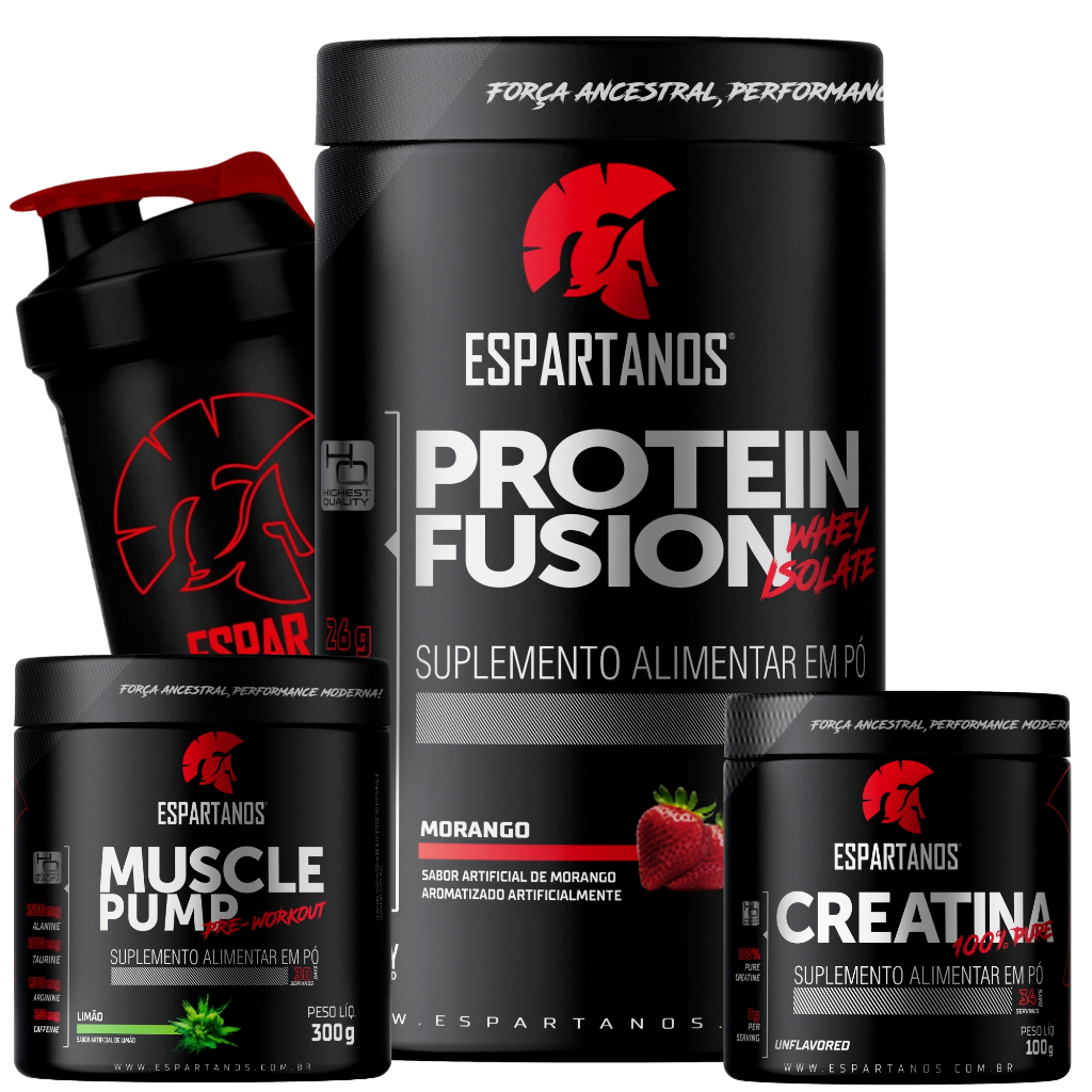 PROTEIN FUSION suplemento proteico formulado com matéria prima importada com mais alto padrão de qualidade, contém um blend exclusivo com 6 diferentes fontes de proteínas de alto valor biológico, incluindo Whey Protein Isolate que tem biodisponibilidade e absorção mais rápida do que qualquer outra fonte de proteína, outro exemplo é Albumina que tem absorção lenta e gradativa mantendo o atleta em estado anabólico por muito mais tempo, evitando assim o catabolismo. MUSCLE PUMP é o resultado da combinação perfeita de ingredientes chave para "explosão muscular". Contém um sua formulação ingredientes que melhora consideravelmente o desempenho nas atividades físicas e reduz a fadiga muscular. Dessa forma, os treinos passam a ser muito mais intensos e eficazes. CREATINA MONOHIDRATADA 100g Espartanos, um dos suplementos mais populares do mercado, além disso é o suplemento mais estudado pela ciência esportiva. Ela é usada por atletas e até mesmo fisiculturistas profissionais. O foco da sua aplicação na dieta é o ganho de massa muscular, garantindo a energia que seu músculo precisa para crescer cada vez mais. Entre os seus benefícios, a creatina aumenta a capacidade do músculo de gerar força. Ajuda diretamente na hipertrofia muscular, aumenta sua capacidade de treino, previne o catabolismo e influência na transcrição gênica. ITENS INCLUSOS: 1 Protein Fusion - Espartanos (900g) 1 Muscle Pump Pré Workout (300g) Sabor (Limão) 1 Creatina 100% Pure - Espartanos (100g) 1 Coqueteleira Shaker Espartanos 🏭 Direto da fábrica: Garantia de qualidade e autenticidade dos produtos! 📦 Envio rápido e seguro para todo o país! 💥 Aproveite e potencialize seus resultados! * Anvisa: Registro Isento Conforme Resolução Rdc 27 De 06 De Agosto De 2010 Anexo I. * A coqueteleira pode variar de acordo com disponibilidade em estoque * Imagens Ilustrativas