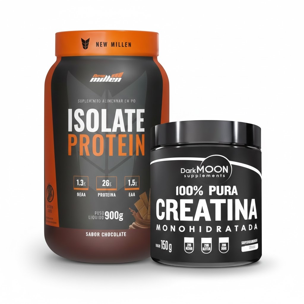 Kit composto por: 1 Whey Protein Isolado Zero Lactose New Millen Pote de 900g 1 Creatina Darkoom Pura 150g Escolha o sabor do whey entre as variações Não trocamos sabores após pedido, escolha com atenção!