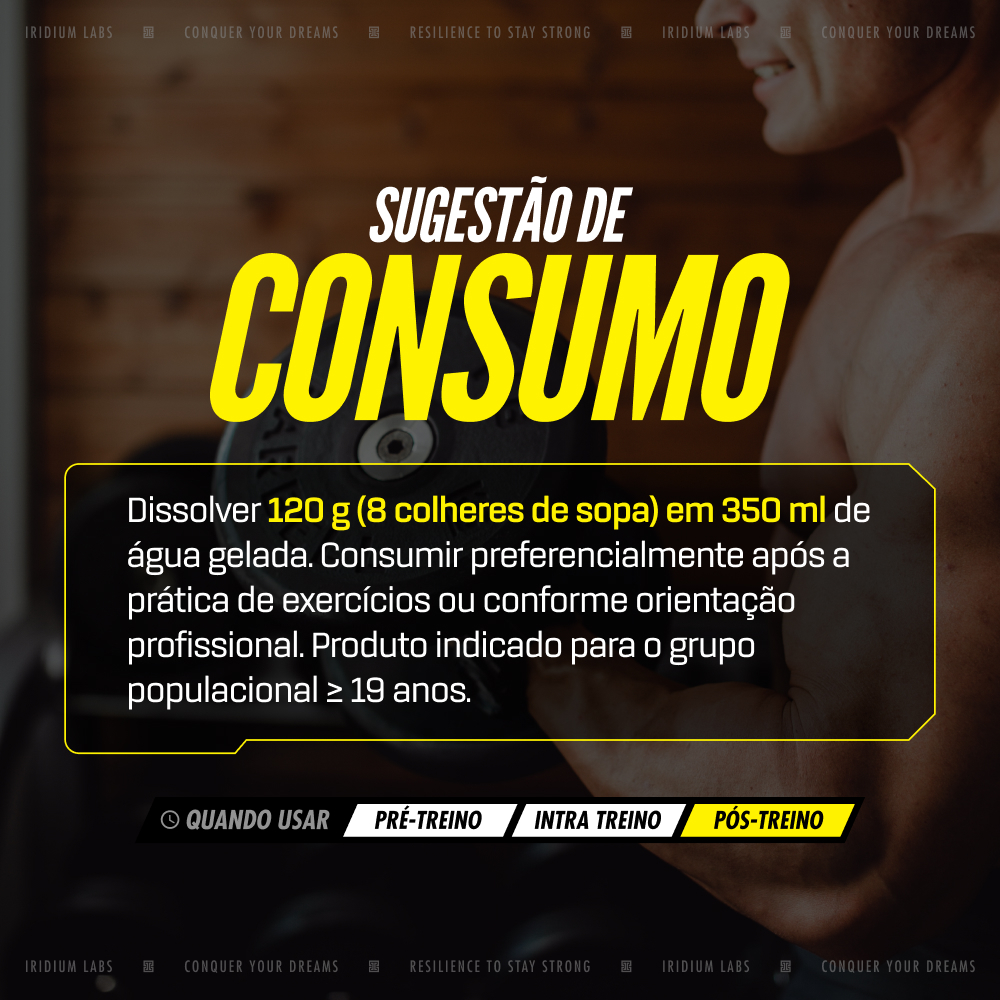 Whey Protein Mega - 900g - Iridium Labs Iridium Mega Whey é melhor que um hipercalórico e vem com maior quantidade de proteína por dose. E isso faz dele um importante aliado no ganho de massa muscular, mas também na recuperação dos músculos após o treino. São 30g de proteína por dose para que você obtenha melhores resultados de hipertrofia, além disso, vem com 77g de carboidratos para te dar mais energia e resistência durante os treinos. Vem também com 6g de BCAA por dose, que ajuda na redução do catabolismo proteico, o que favorece o ganho de força muscular e reduz a perda de massa muscular durante o processo de perda de peso. É importante ressaltar que contém 2,8g de Leucina por dose, aminoácido que age durante o processo de recuperação dos músculos, que ocorre no pós-treino, quando você está descansando ou dormindo. Características: 30g DE PROTEÍNA POR DOSE Favorece a Hipertrofia. 6g DE BCAA POR DOSE Ajuda no aumento da força muscular. 2,8g DE LEUCINA POR DOSE Atua na recuperação dos músculos após o treino. Creatina Fuel Monohidratada 150g - Iridium Labs Tenha mais energia nos treinos de força e potencialize seus ganhos de hipertrofia muscular. Aumente sua força e volume muscular sem prejudicar seu bolso! A Creatina Fuel chegou para mostrar que é possível obter todos os benefícios da suplementação de uma creatina de qualidade sem gastar rios de dinheiro. Isso porque, sua fórmula contém maltodextrina em uma pequena quantidade, são apenas 2,8 de carboidratos por porção para 3g de creatina. E se você acha que consumindo essa quantidade terá prejuízo na dieta você está enganado. Veja só, 2,8g de carboidrato é o equivalente a 100g de alface que você consumiria no almoço e no jantar. Por isso não se assuste em pensar que consumindo essa quantidade de malto estará arruinando sua dieta. A creatina é um suplemento natural usado para aumentar o desempenho atlético. Não é apenas seguro, mas também um dos suplementos mais populares e eficazes do mundo. É um dos principais combustíveis energéticos para as células musculares produzirem energia em exercícios curtos de alta intensidade. Além disso, a creatina é um suplemento popular e eficaz no aumento da massa muscular. Ela é capaz de alterar inúmeras vias celulares que levam ao crescimento dos músculos. Por exemplo, aumenta a formação de proteínas que criam novas fibras musculares. Também pode aumentar os níveis de fator de crescimento semelhante à insulina 1 (IGF-1), um hormônio que promove aumento na massa muscular. E não é só isso, hoje a creatina vem sendo estudada e empregada para fins medicinais como no tratamento de doenças neurodegenerativas. Dessa forma, a creatina é um suplemento eficaz com benefícios poderosos para o desempenho atlético e para a saúde ! Coqueteleira 600 ml - Iridium Labs Ideal para os seus treinos Características: Material: Polipropileno Compartimentos: Não possui Cor: Amarela Altura total : 210mm Largura total: 100mm Diâmetro superior: 100mm Diâmetro inferior: 68mm Capacidade: 600ml