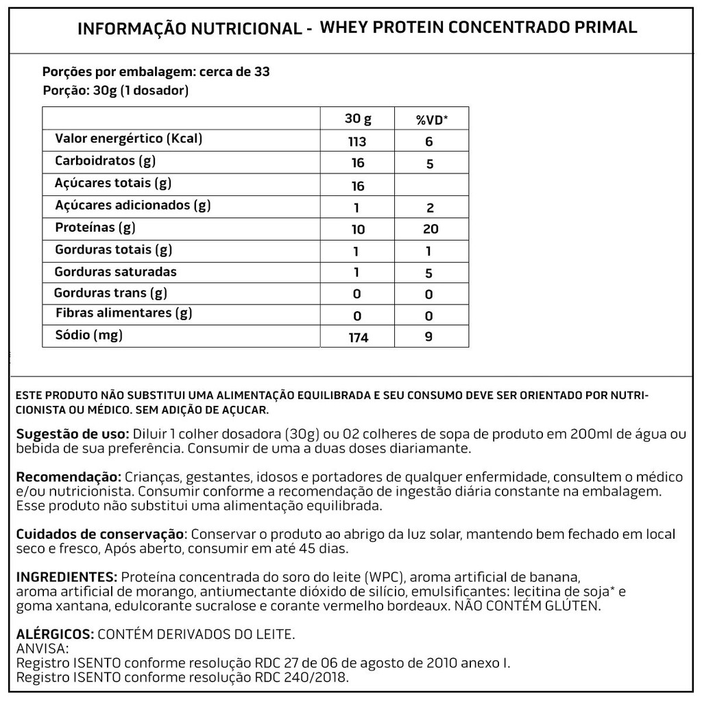 Kit: Whey Primal + Pré-Treino Flames 200g - Soldiers Nutrition O kit contém: - Whey Protein Primal 1Kg - Pré-Treino Flames 200g Descrição: Whey Protein Primal 1Kg - Importado - Soldiers Nutrition Primal Whey é um suplemento alimentar à base de whey protein concentrado (proteína concentrada do soro do leite) para ser utilizado no dia a dia, para atingir a quantidade de proteínas na dieta, ganho de massa muscular ou como suplementação para praticantes de esportes e atividades físicas. É ideal para quem busca uma fonte de proteínas saudável e deliciosa. Benefícios Matéria-prima importada (Whey Protein Concentrado) Proteína de alta qualidade Sabor incomparável Baixas quantidades de carboidratos e gorduras Contém aminoácidos essenciais Auxilia na sensação de saciedade Aliado da recuperação e construção muscular Disponível em 8 sabores deliciosos: Baunilha, Morango, Beijinho, Chocolate Belga, Mocaccino, Cookies, Banana e Banana com Morango INGREDIENTES: Proteína concentrada do soro do leite (WPC), aroma artificial, antiumectante dióxido de silício, emulsificantes: lecitina de soja* e goma xantana e edulcorante sucralose. *utilizado na fabricação da proteína com a função de deixar o produto instantâneo (fácil diluição). NÃO CONTÉM GLÚTEN. CONTÉM LACTOSE. ALÉRGICOS: CONTÉM DERIVADOS DE LEITE E SOJA. Recomendação de Consumo: Diluir 01 colher dosadora (30g) ou 02 colheres de sopa do produto em 200ml de água ou bebida de sua preferência. Consumir de uma a duas doses diariamente. Recomendação: Crianças, gestantes, idosos e portadores de qualquer enfermidade, consultem o médico e/ou nutricionista. Consumir conforme a recomendação de ingestão diária constante na embalagem. Esse produto não substitui uma alimentação equilibrada. Produto indicado para o grupo populacional ≥ 19 anos. Cuidados de Conservação: Conservar o produto ao abrigo da luz, mantendo bem lacrado em local seco e fresco. Após aberto, consumir em até 45 dias. Suplemento Alimentar dispensado de registro conforme Resolução RDC nº 240/2018. Pré-Treino Flames 200g - 100% Importado - Soldiers NutritionBENEFÍCIOS DO FLAMES:- Aumento de energia e disposição;- Foco nos treinos;- Tira a fadiga;- Aumento de força e concentração nos treinos;- Aumento de resistência física;Informação Nutricional:Porção 2 scoops ou 10 gramasValor energético 11 kcal ou 46KJ 0%Carboidratos 2,8g 1%Gorduras Totais 0g **Gorduras Saturadas 0g **Fibra Alimentar 0g **Sódio 0g **L-Arginina 2000mg **Beta Alanina 2000mg **Taurina 2000mg **L-Tirosina 500mg **Cafeína 200mg **O pré treino é feito para quem pratica exercícios com muita intensidade e necessita de mais energia para manter o auto nivel de treinamento. Ele auxilia na melhora do desempenho durante a prática dos exercícios físicos, reduzindo o cansaço, a falta de foco e a indisposição.Composto por diversos ingredientes essenciais para manter a energia corporal alta como por exemplo a cafeína e taurina. Além de outros nutrientes que são necessários para a realização de exercícios de alto desempenho e intensos. Aumentando a resistência física e diminuindo a fadiga.ANVISA:Registro ISENTO conforme resolução RDC 27 de 06 de agosto de 2010 anexo I.Registro ISENTO conforme resolução RDC 240/2018.