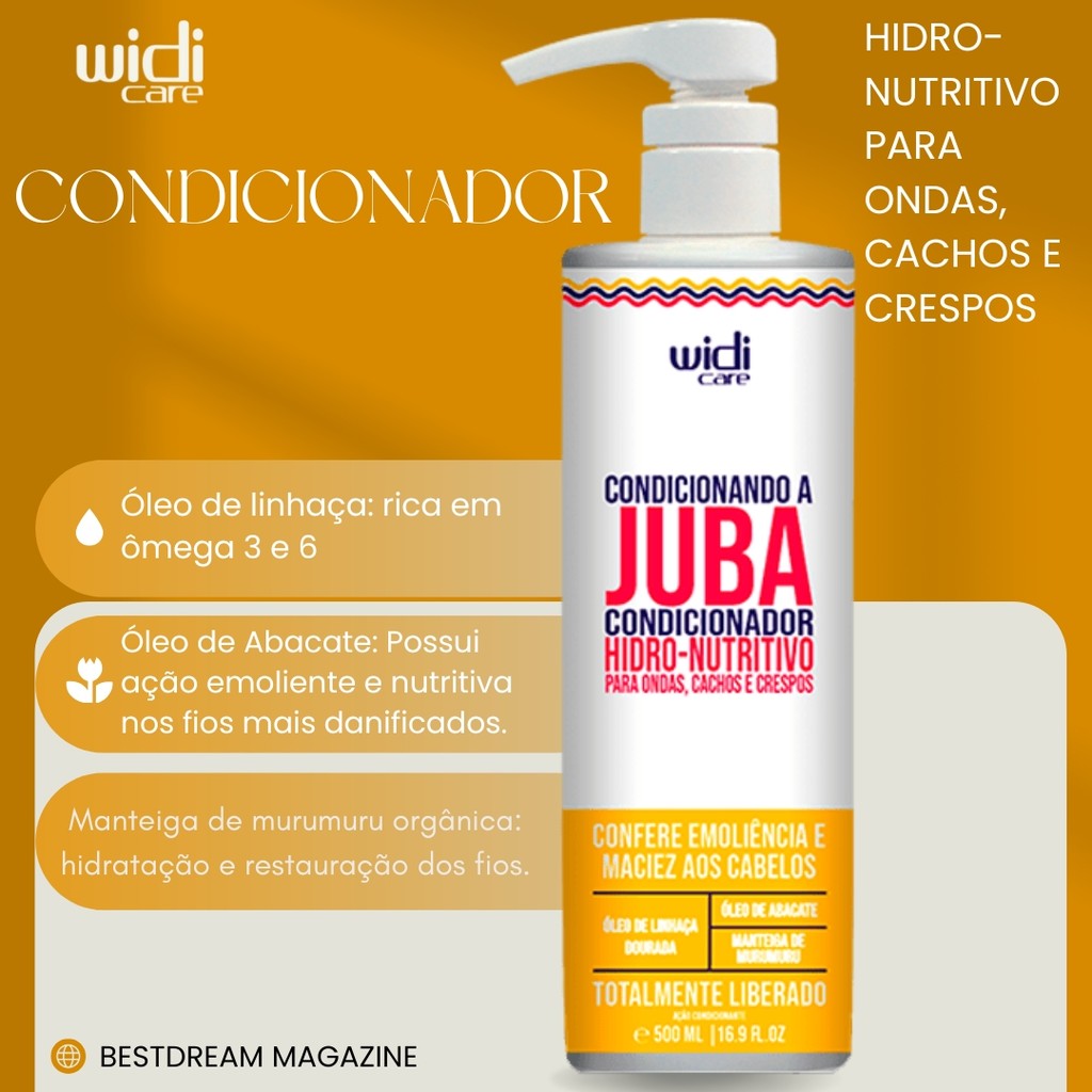 ENVIO IMEDIATO MEGA KIT PERSONALIZADO ! A linha de tratamento Juba foi especialmente desenvolvida para atender às necessidades dos cabelos ondulados (2a, 2b, 2c), cacheados (3a, 3b, 3c) e crespos (4a, 4b, 4c). Essa linha é formulada com ativos 100% vegetais, visando proporcionar brilho, definição e hidratação aos fios. Os produtos Juba são ricos em Ômega 3 e 6, auxiliando no condicionamento e brilho acetinado, além de manter a definição dos cachos por até 48 horas. - PRODUTO 100% VEGANO - LIVRE DE CRUELDADE MODO DE USO: Higienizando a Juba Shampoo: Com os cabelos molhados, aplique o shampoo no couro cabeludo e massageie para obter uma espuma hidratante. Deixe agir enquanto espalha a espuma por todo o comprimento dos cabelos e enxágue bem. Juba Máscara Hidro-Nutritiva: Após lavar os cabelos com o shampoo, retire o excesso de água e aplique uma quantidade generosa da máscara nos fios úmidos, enluvando-os bem. Deixe agir de 5 a 10 minutos, com ou sem calor, e enxágue abundantemente. Condicionando a Juba Condicionador: Com os cabelos limpos, aplique o condicionador por todo o comprimento e pontas dos fios. Deixe agir por 3 minutos e enxágue retirando todo o excesso. Modelando A Juba - Após aplicar o Encrespando ou Encaracolando a Juba nos seus cabelos, distribua uma quantidade adequada da Geleia Juba nas palmas das mãos. Encaracolando A Juba - Com cabelos úmidos, aplique nas mechas, começando pela nuca. Use Encaracolando a Juba Creme de Pentear em mechas finas, modelando de baixo para cima. Deixe secar naturalmente ou com difusor. Mousse Juba - Coloque uma pequena quantidade do mousse na palma da mão. Aplique o produto nos cabelos úmidos, começando da nuca em direção à testa, da raiz até as pontas. Para obter uma definição ainda maior dos cachos, você pode secar os cabelos com um difusor, começando de baixo para cima. Blend Oil - Aplique uma pequena quantidade do Juba Blend de Óleos Vegetais nos cabelos úmidos ou secos como toque final para dar brilho e hidratação ESSE ANÚNCIO CONTÉM: 01x Shampoo Higienizando A Juba 500ml Widi Care 01x Condicionador Condicionando A Juba 500ml Widi Care 02x Encaracolando A Juba 500ml Widi Care 01x Mascara Hidro Nutritiva Juba 500g Widi Care 01x Mousse Juba 200ml Widi Care 01x Geleia Modelando A Juba 300g Widi Care 01x Blend Oil Oléo Vegetal Juba 60ml Widi Care