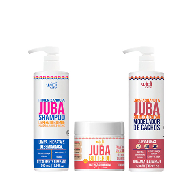 Primer Cosméticos. Realce o natural , brilhe com confiança. O Kit Juba Widi Care, com Shampoo, Máscara Butter Oil e Creme de pentear Encaracolando, nutre e define os cachos, proporcionando fios emolientes, macios e saudáveis. Ideal para cabelos cacheados.O kit é composto por:Shampoo Higienizando A Juba 500 mlMáscara Nutrição Juba Butter Oil 500gCreme de Pentear Encaracolando A Juba 500 mlShampoo:O Higienizando a Juba Shampoo é projetado para limpar eficazmente os cabelos sem ressecar ou causar embaraços, especialmente em cabelos com curvatura. Sua fórmula única permite uma limpeza suave, criando espuma sem embaraçar os fios.Ativos:Óleo de linhaça douradaExtrato de avelãMáscara:A BUTTER OIL JUBA é um tratamento capilar intensivo condicionante desenvolvido para nutrir e revitalizar os cabelos, especialmente os mais ressecados e danificados. Sua fórmula é rica em óleos e manteigas que proporcionam uma nutrição profunda aos fios, restaurando sua saúde e luminosidade. Os principais ingredientes ativos incluem Manteiga de Karité, Manteiga de Ucuuba, Manteiga de Pistache e Óleo de Jojoba.Ativos:Manteiga de ucuuba;Manteiga de pistache;Manteiga de karité.Creme de Pentear:Cansados dessa história de controle dos cachos? A linha Juba traz para você, que é cacheada e ama sua cabeleira volumosa, o ENCARACOLANDO A JUBA CREME DE PENTEAR, que define, nutre, condiciona, hidrata e empodera suas madeixas com auxílio dos ativos: Manteiga de Murumuru Orgânica, Óleo de Linhaça Dourada e Extrato de Avelã. MARA, né? Agora solte sua juba, ame seus cachos e sinta-se plena!Ativos:Óleo de linhaça douradaExtrato de avelãManteiga de murumuru orgânica Como usar: Shampoo:Aplique o shampoo nos cabelos molhados, massageando o couro cabeludo e distribuindo-o pelos fios. Deixe agir enquanto espalha a espuma por todo o comprimento do cabelo e, em seguida, enxágue completamente. Máscara:Aplicação convencional: Após lavar seus cabelos, aplique uma quantidade suficiente da BUTTER OIL JUBA nos fios, assegurando-se de distribuir o produto de maneira uniforme. Massageie suavemente e deixe agir por 5 a 10 minutos. Enxágue bem e, em seguida, modele seus cabelos conforme desejado. Você pode continuar sua rotina de cuidados capilares normalmente.Umectação noturna: Para um tratamento ainda mais intensivo, especialmente indicado para cabelos extremamente ressecados, você pode usar a BUTTER OIL JUBA como umectação noturna. Antes de dormir, com os cabelos secos, aplique o produto em todo o comprimento e nas pontas dos fios. Deixe agir por até 8 horas durante o sono e, no dia seguinte, lave seus cabelos como de costume. Essa técnica ajuda a proporcionar uma nutrição profunda e duradoura aos cabelos.Creme de Pentear:Com o cabelo úmido, divida-o em mechas finas e inicie o processo pela parte da nuca para ficar mais fácil a aplicação.Coloque uma quantidade suficiente do ENCARACOLANDO A JUBA CREME DE PENTEAR nas mãos e aplique nos cabelos fazendo fitas em mechas finas.Repita esse processo por todo o cabelo e depois modele as mechas de baixo para cima para ajudar na definição.Deixe secar naturalmente ou com ajuda de um difusor.