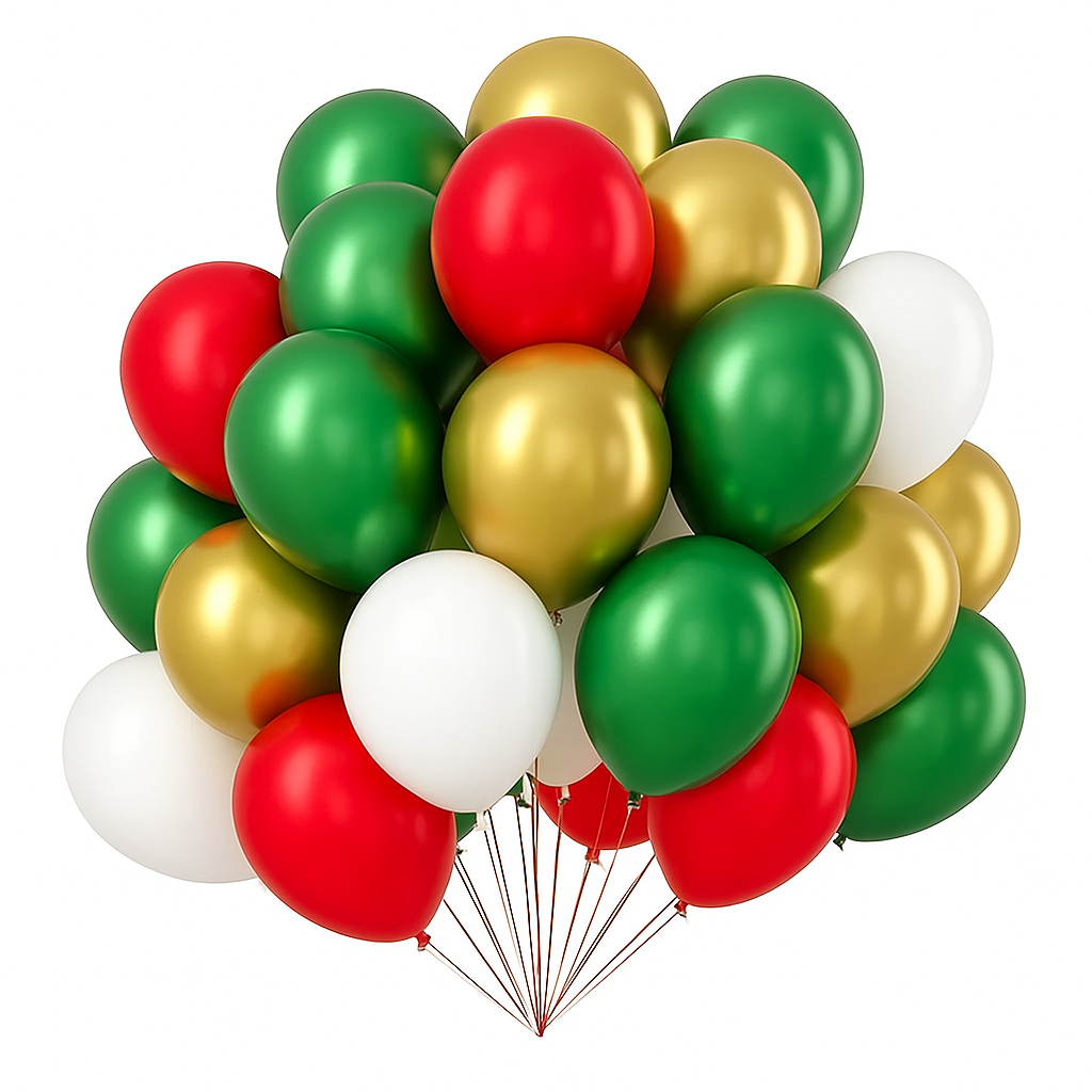 KIT150 BALAO 25 BALÃO 5’ VERDE CROMADO +50 BALÃO 7’ VERMELHO + 25 BALÃO OURO CROMADO 5’ + 50 Balao branco 5’ Balão natal