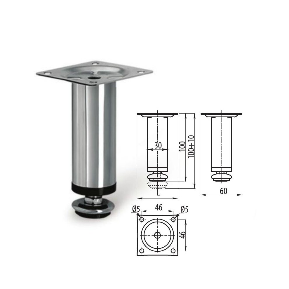 ** Acompanha os parafusos para fixação ** Os pés redondos são suportes desenvolvidos para manter a estrutura do móvel segura, estável, aumentando a vida útil do mesmo. Possuindo um sistema de regulagem de altura, permite maior controle de estabilidade nivelando os móveis até mesmo em pisos irregulares. Pode ser aplicados em armários, racks, balcões, estantes, entre outros, ajudando na revitalização da decoração da sua casa. Altura sem regulagem: 100mm Altura com regulagem: 110mm Acabamento: Cromado Material: Aço Base chapa 4 furos para fixação Capacidade de carga: 100 kgs (cada)